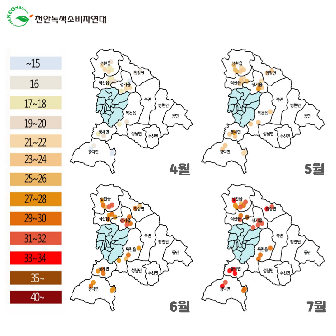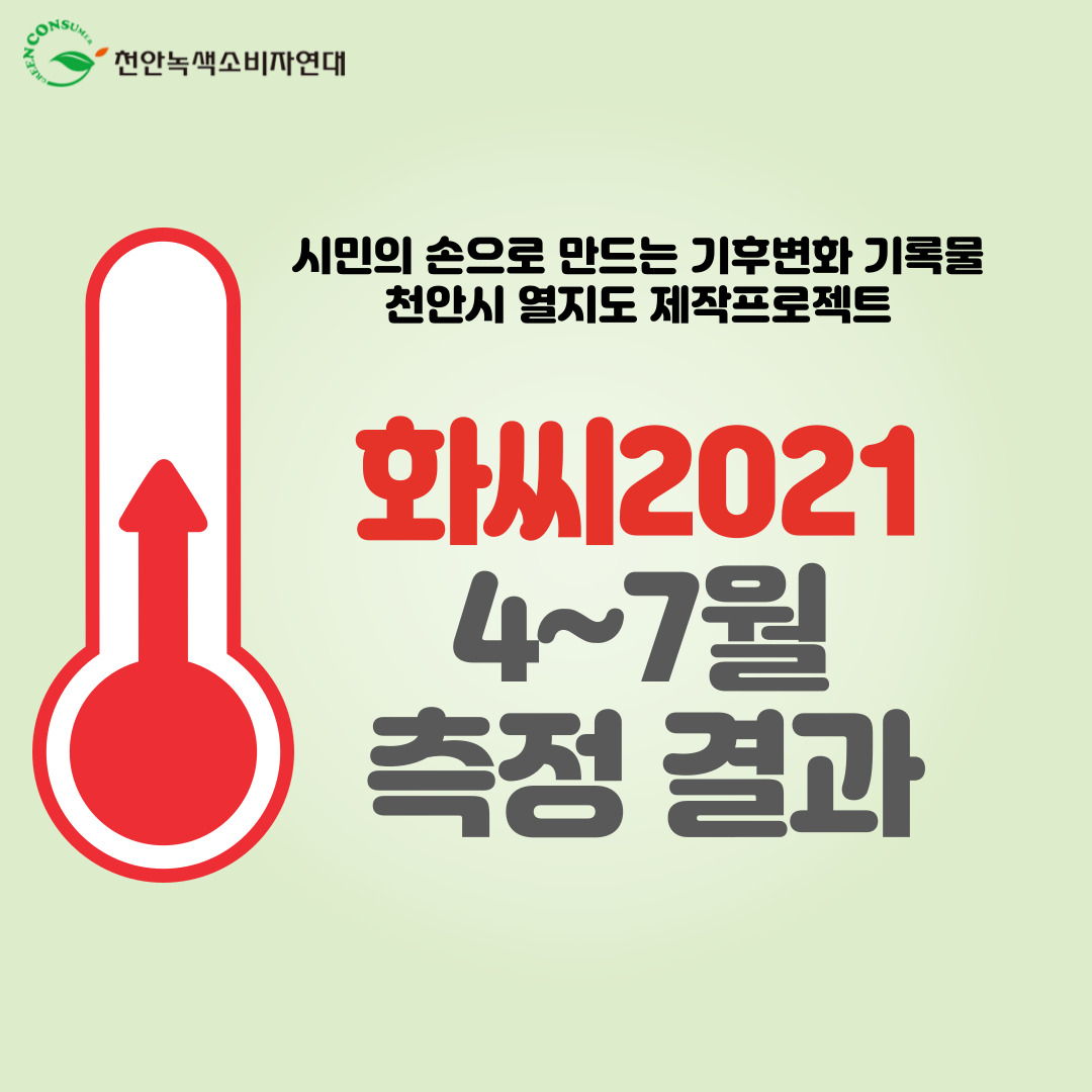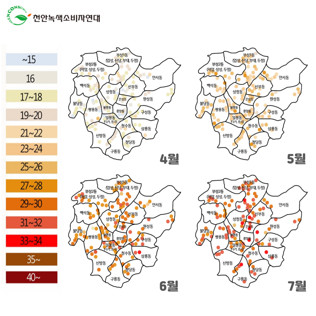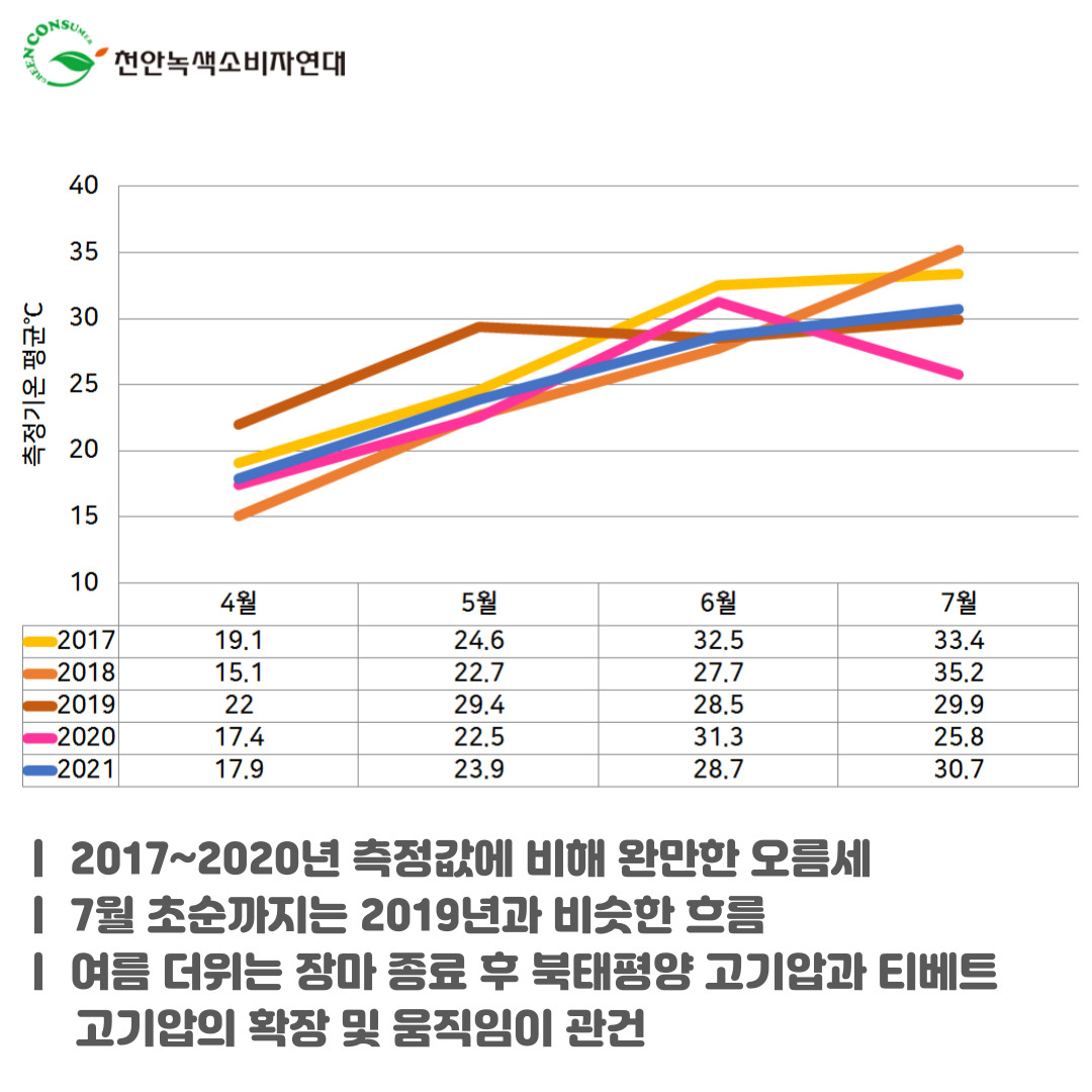 천안시 열지도 제작프로젝트 화씨2021 4월~7월 기온측정 결과입니다. 그래프상으로는 완만한 오름세를 보이며 2019년과 비슷한 흐름을 가져왔습니다. 장마 종료 후의 기온 상승이 관건입니다.