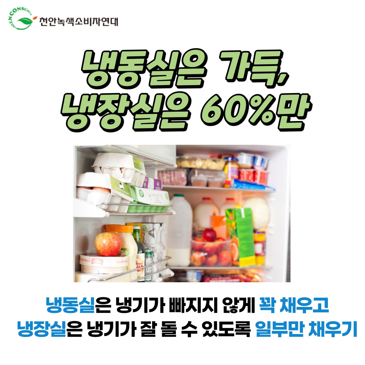 냉동실은 냉기가 빠지지 않게 꽉 채우고 냉장실은 냉기가 잘 돌 수 있도록 일부만 채우기