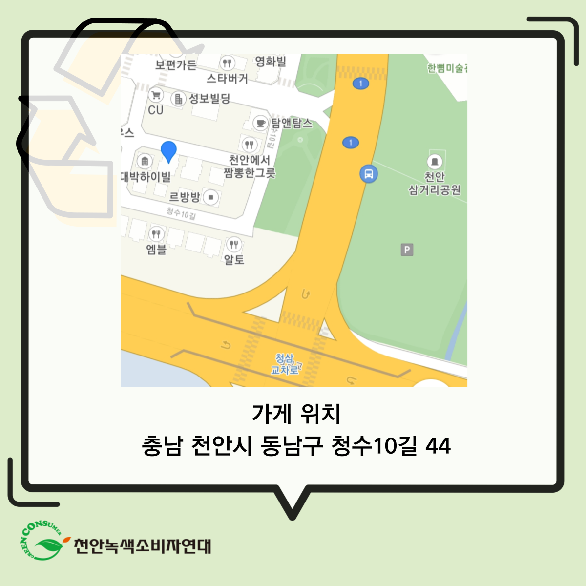 천안녹색소비자연대와 함께 다양한 활동을 함께 하고 있는 제로웨이스샵 ‘푸른별 상점’의 바로 옆에 위치해있습니다. 인연이 또 이렇게 이어지는 거겠죠? 주문제작하는 레터링 케이크가 어여쁜 카페입니다.