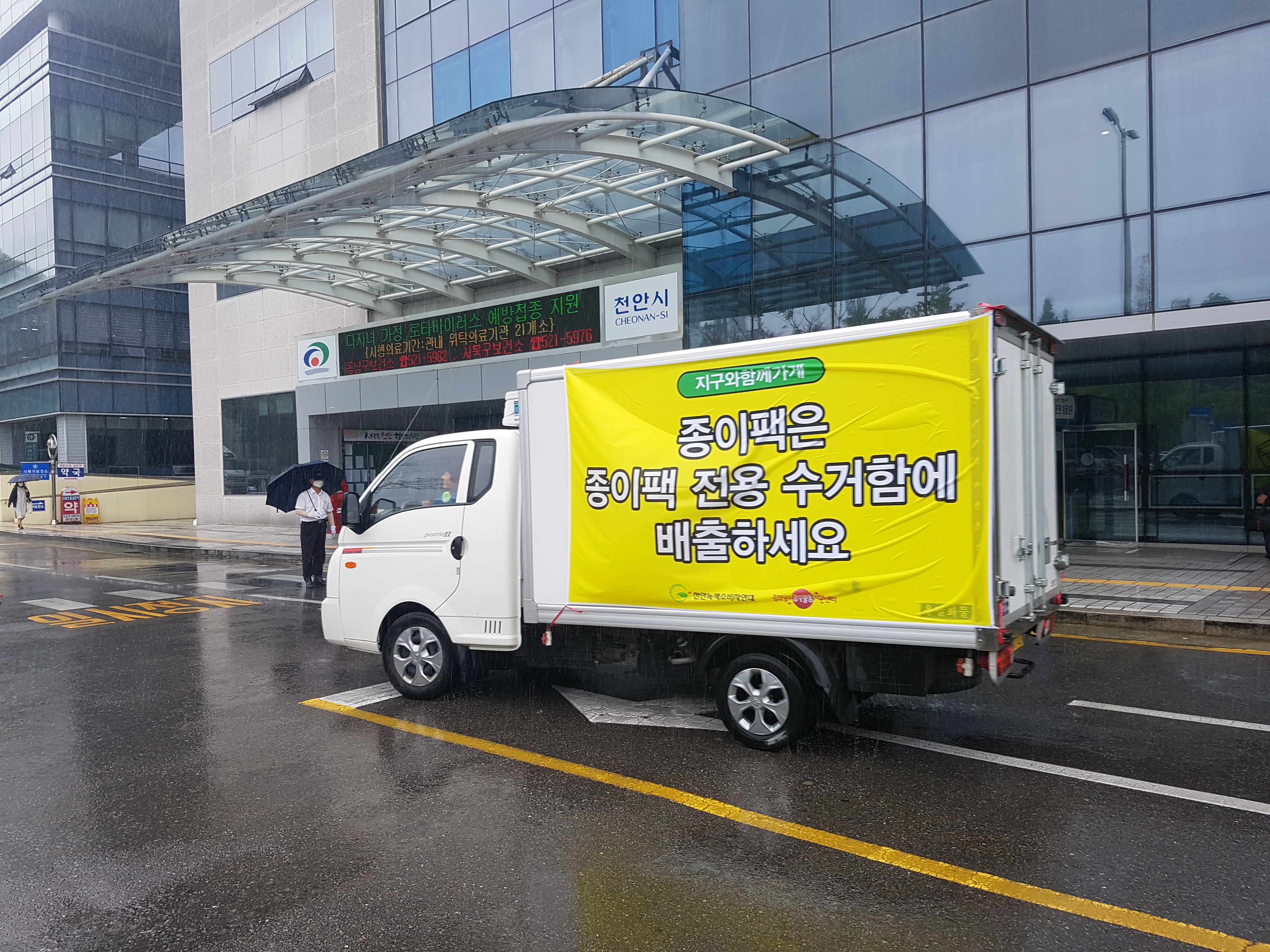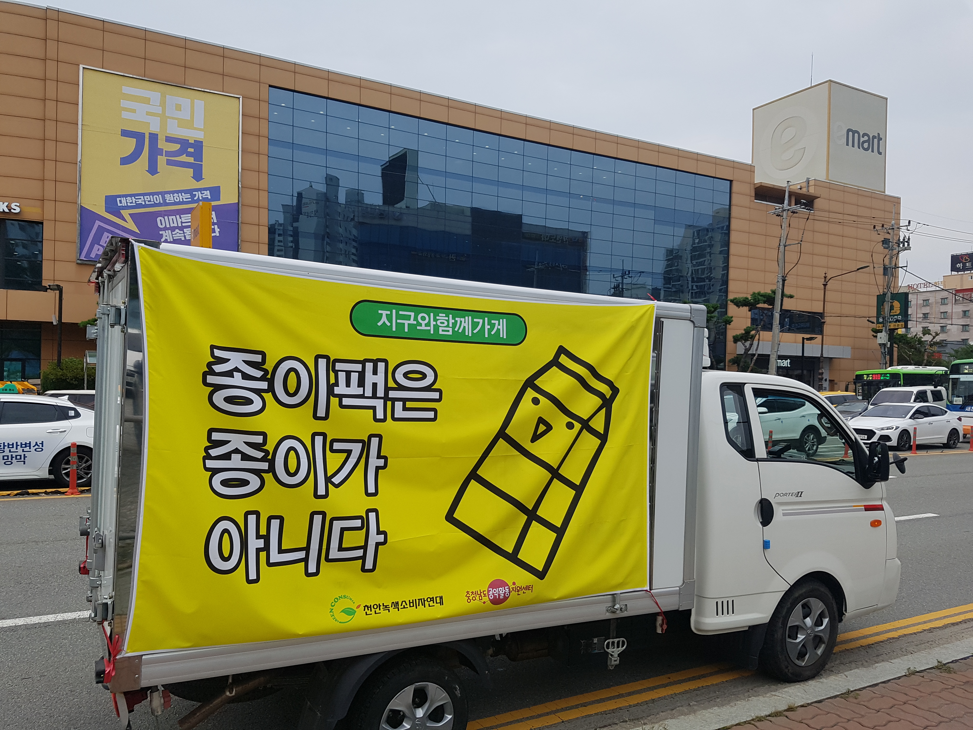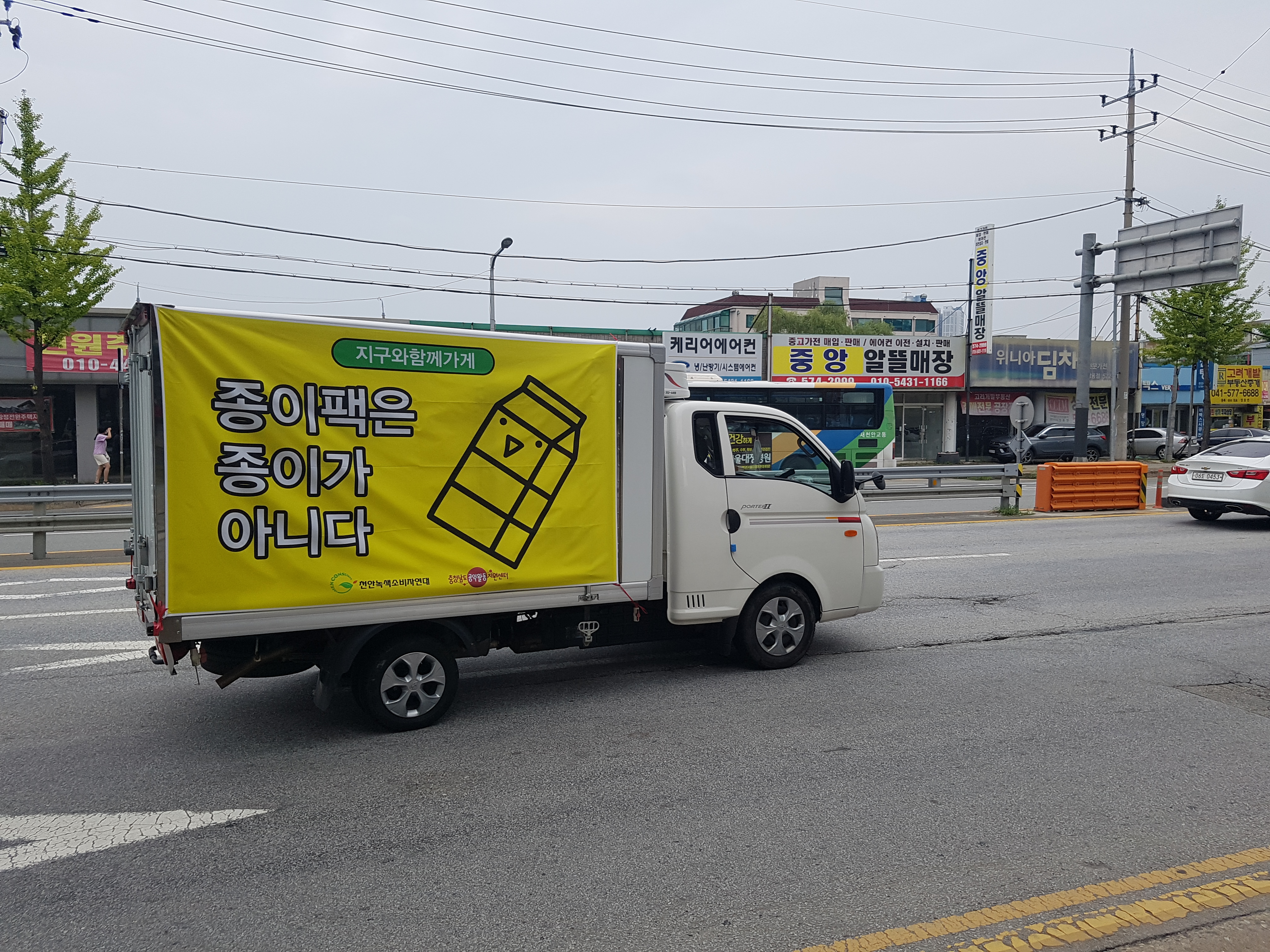 어제와 오늘 ‘종이팩은 종이가 아니다’ 슬로건을 내건 차량을 운행했습니다. 종이팩 분리 배출 체계 구축 마련 촉구 및 시민인식 개선을 위한 드라이브 캠페인입니다. 흐린 날씨 속에서 도로 위 노란색 현수막이 눈에 확 뛰죠?