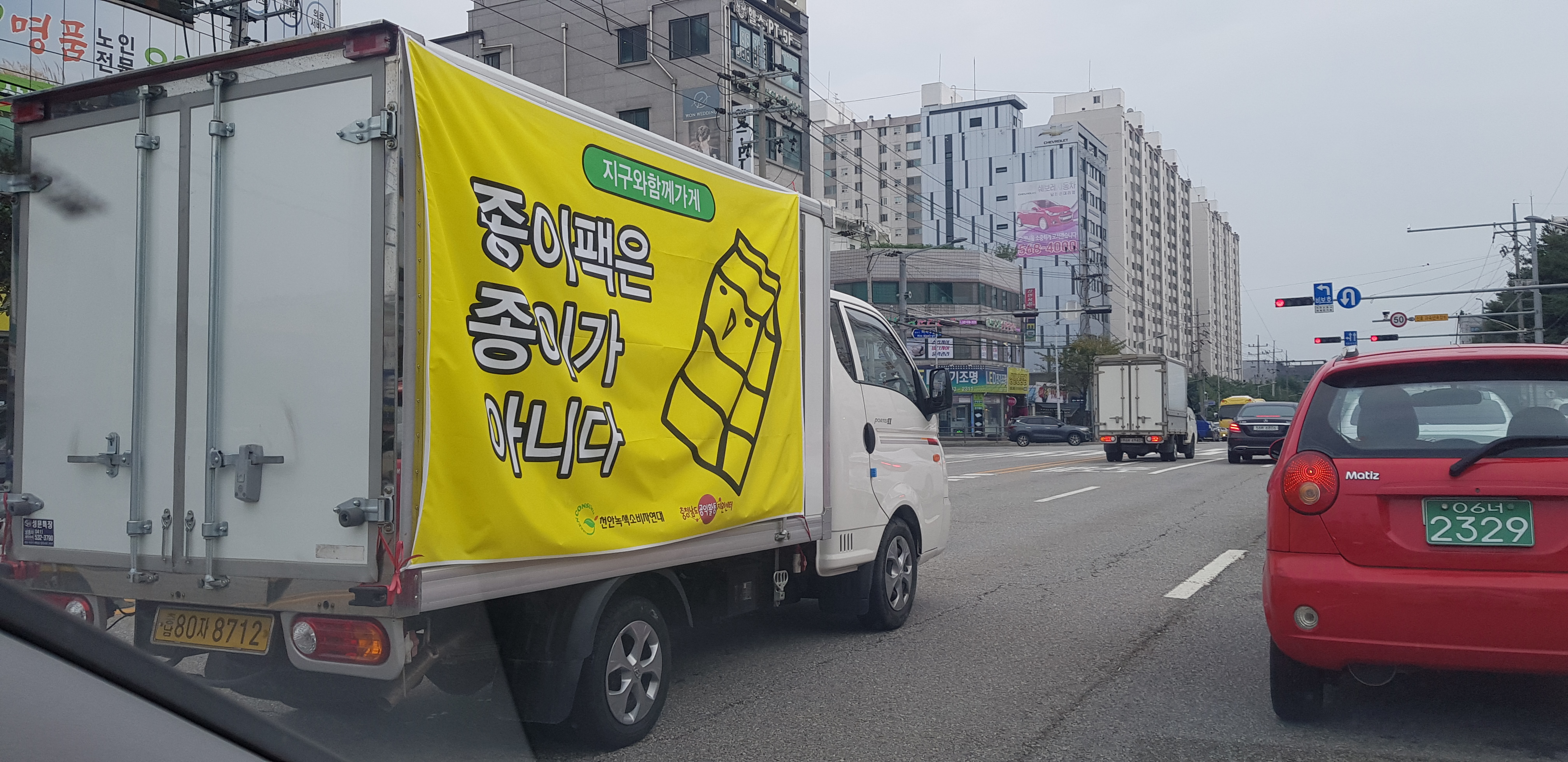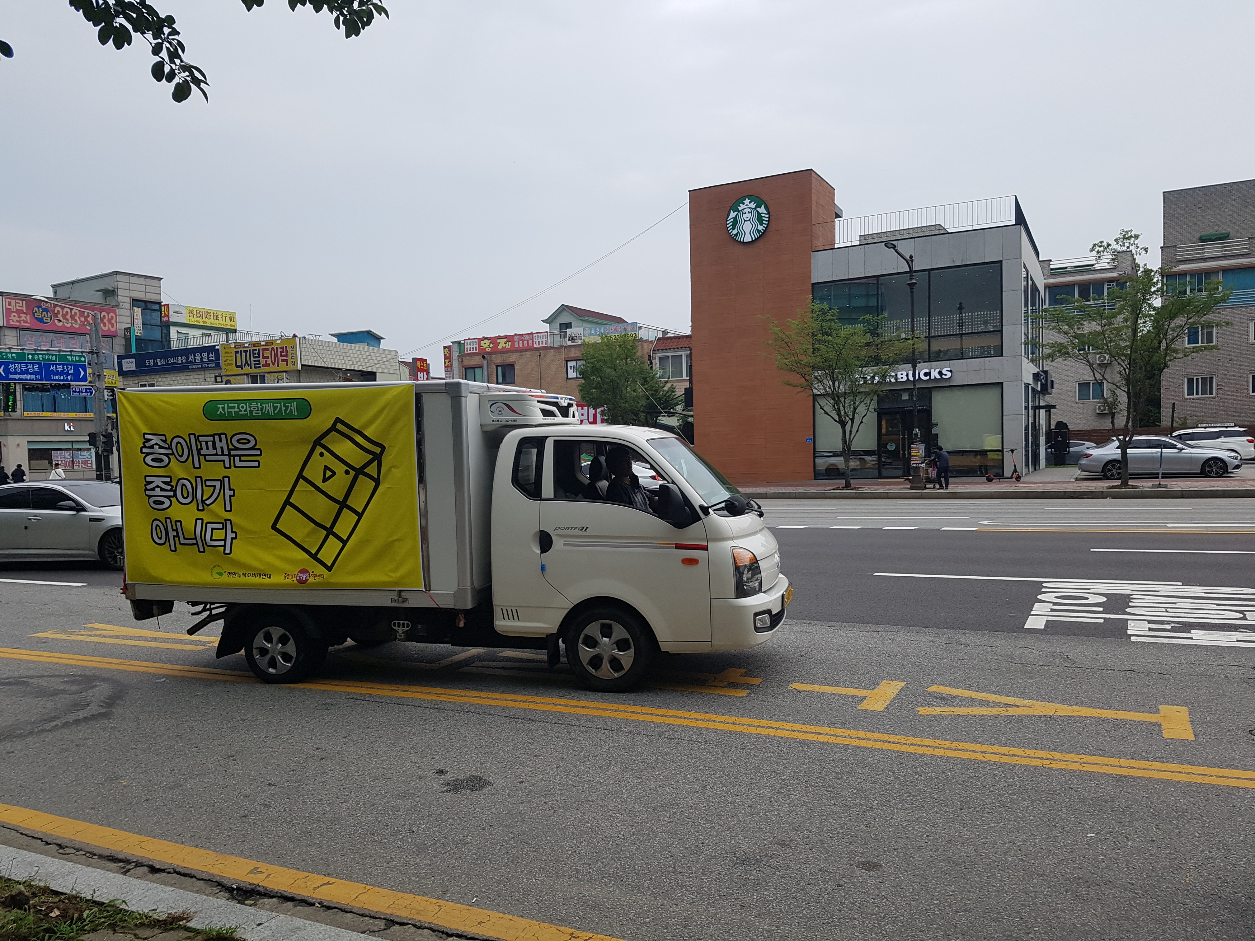 어제와 오늘 ‘종이팩은 종이가 아니다’ 슬로건을 내건 차량을 운행했습니다. 종이팩 분리 배출 체계 구축 마련 촉구 및 시민인식 개선을 위한 드라이브 캠페인입니다. 흐린 날씨 속에서 도로 위 노란색 현수막이 눈에 확 뛰죠?