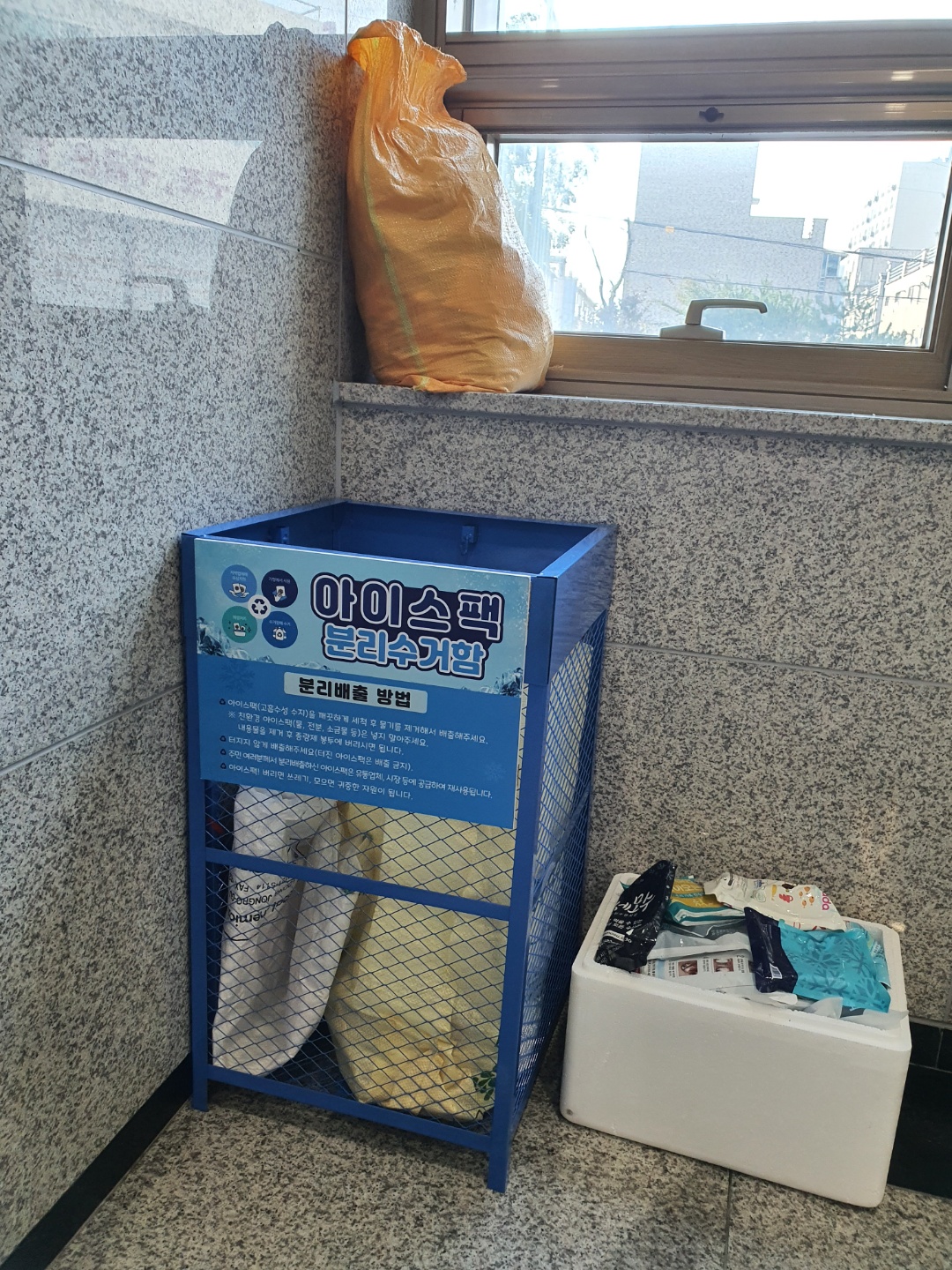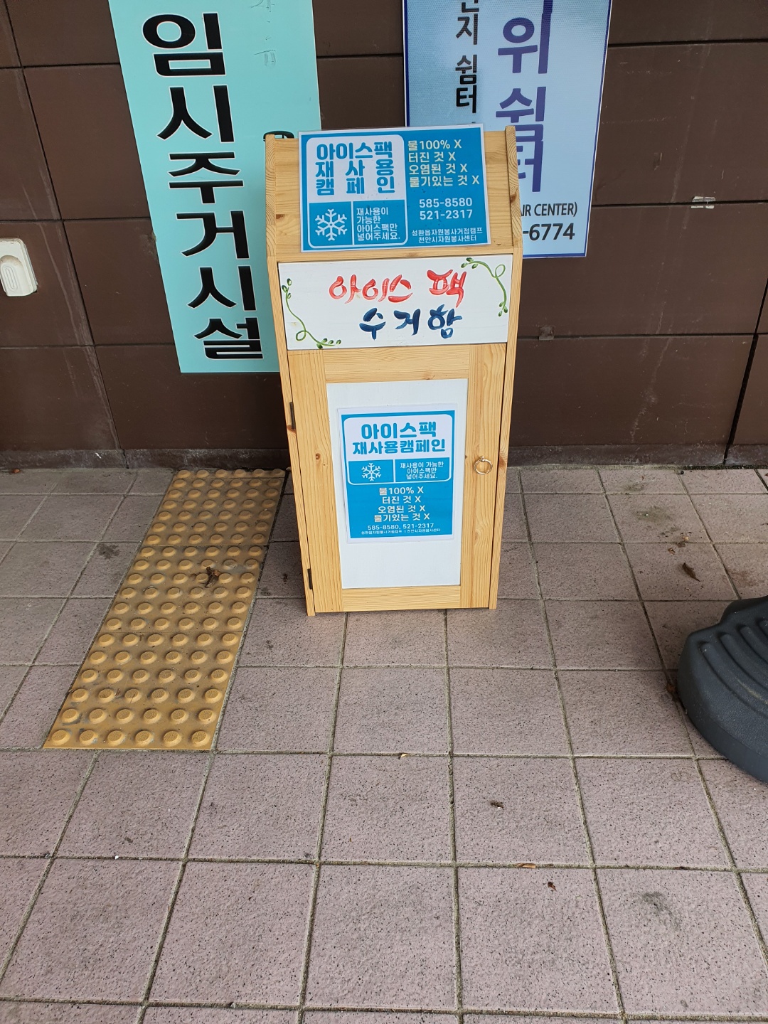 직산읍행정복지센터-1층 민원창구 뒤쪽의 사무 공간으로 진입해야 합니다. 1층 중간에 위치한 산업건설팀 사무공간을 뚫고 지나가야한다는 부담스러움이 있습니다. 직산읍 센터에도 아이스팩 수거함이 있었습니다. (화장실앞 구석)