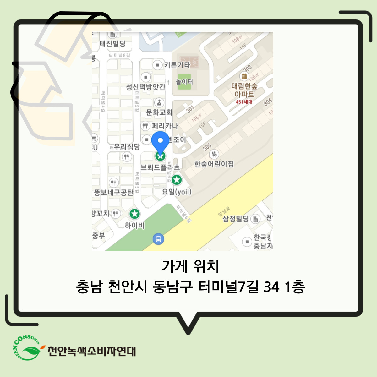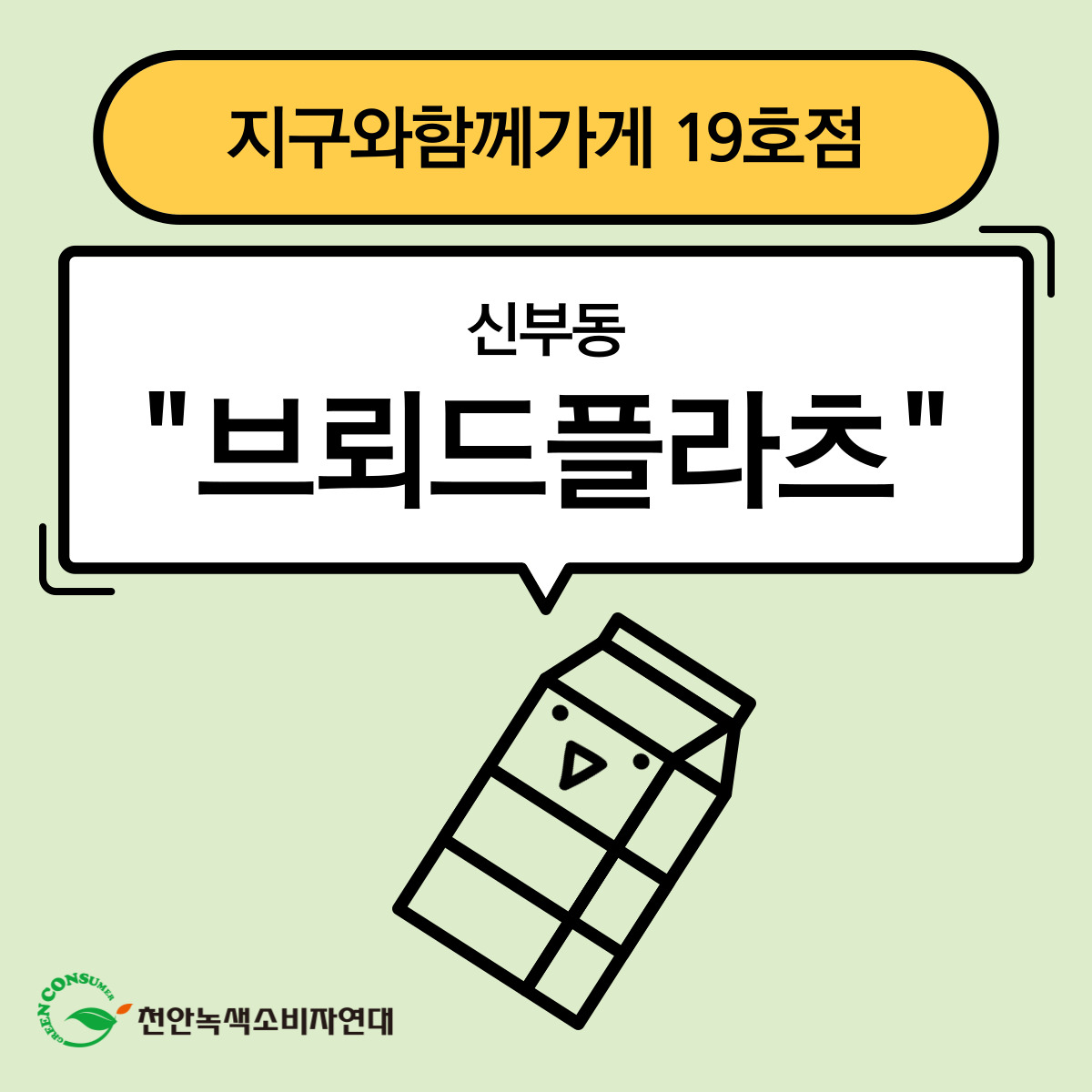 종이팩 분리배출에 함께 하는 <지구와함께가게> 19호점을 소개합니다. 신부동 터미널 근처 ‘브뢰드플라츠’입니다. 17호점 요일 대표님의 소개로 연을 맺게 되었습니다.