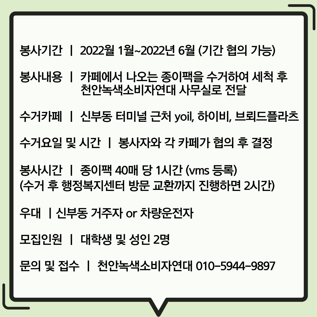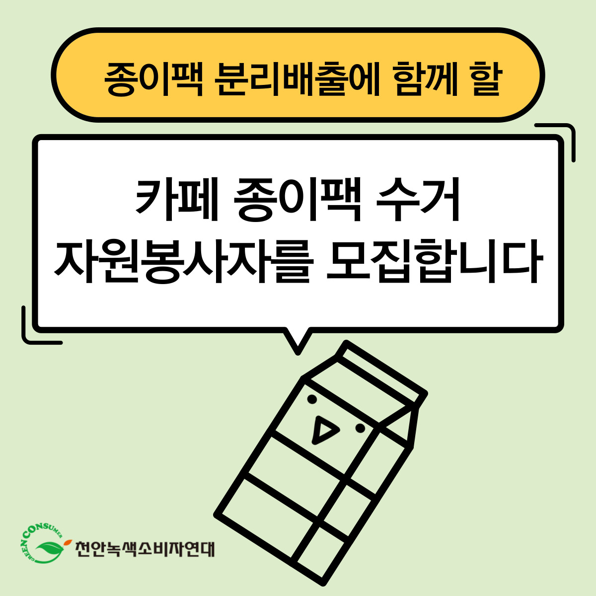 봉사내용 : 카페에서 나오는 종이팩을 수거하여 세척 후 천안녹색소비자연대 사무실로 전달