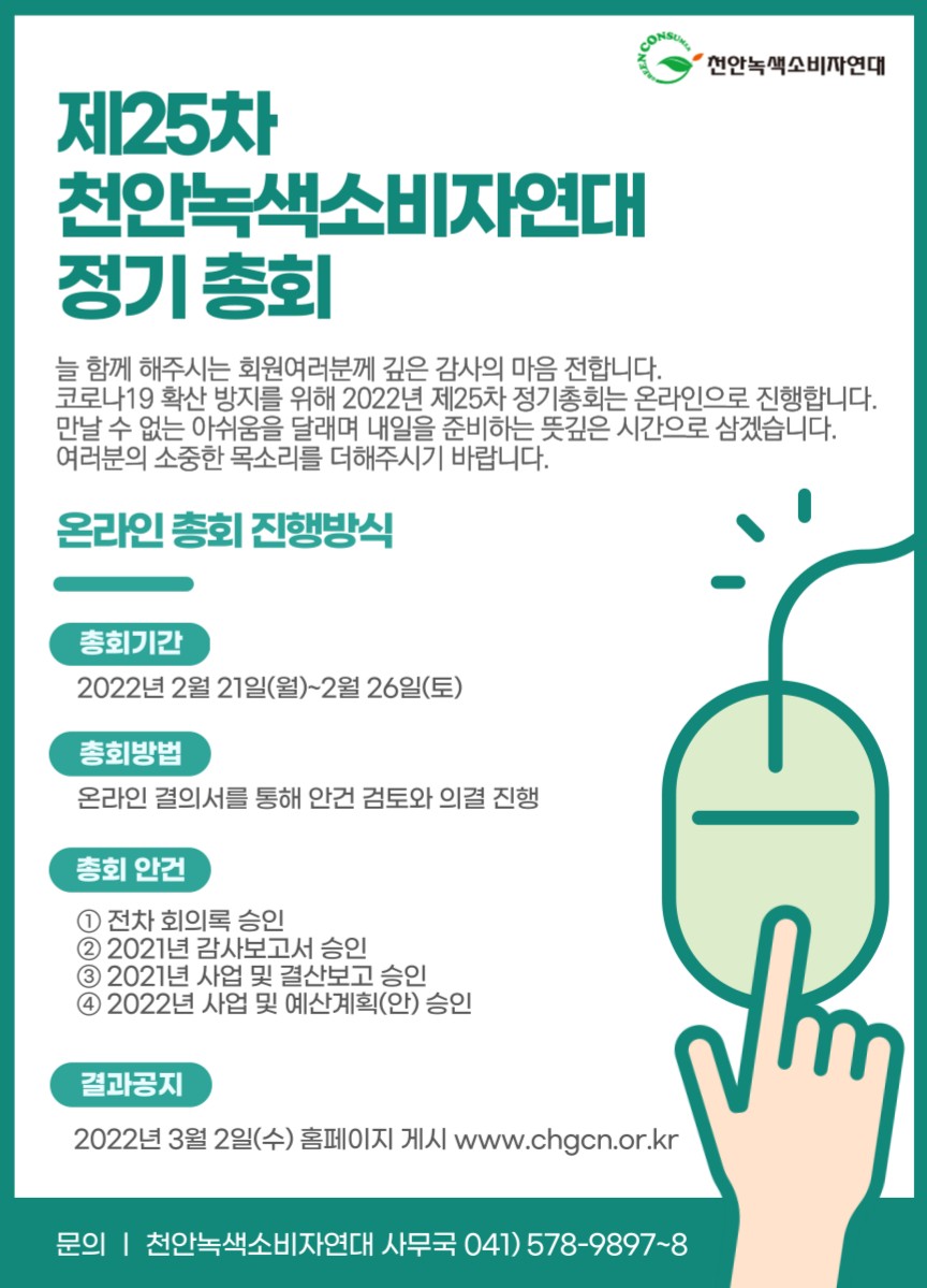 2022년 제25차 천안녹색소비자연대 정기총회는 회원여러분의 안전과 지역사회 방역을 위해 전면 온라인으로 진행합니다. 총회는 다가오는 2월 21일부터 26일 사이에 진행되며, 해당 기간 동안 안건 검토와 온라인 의결권 행사(네이버폼 응답)가 이루어집니다.