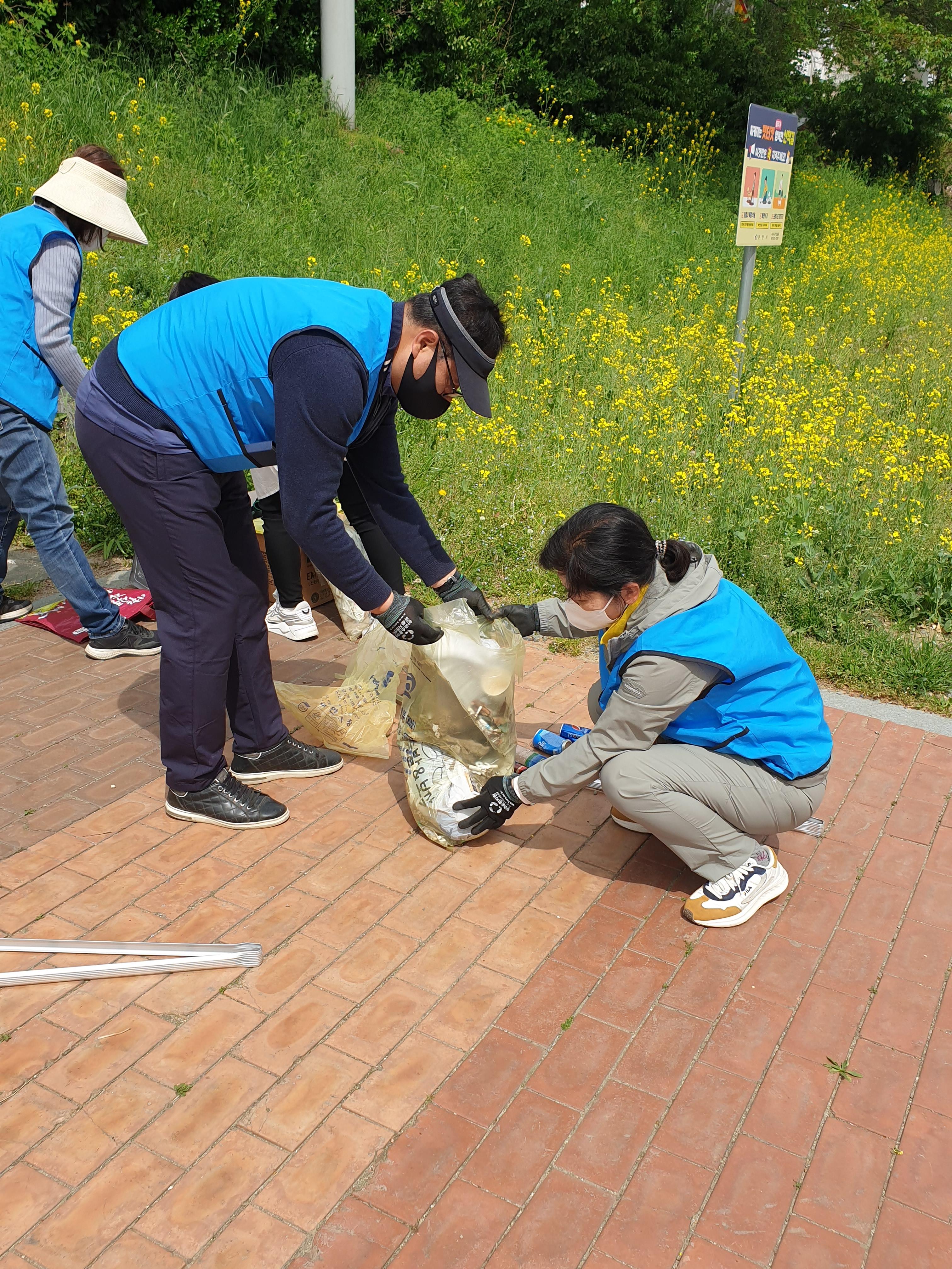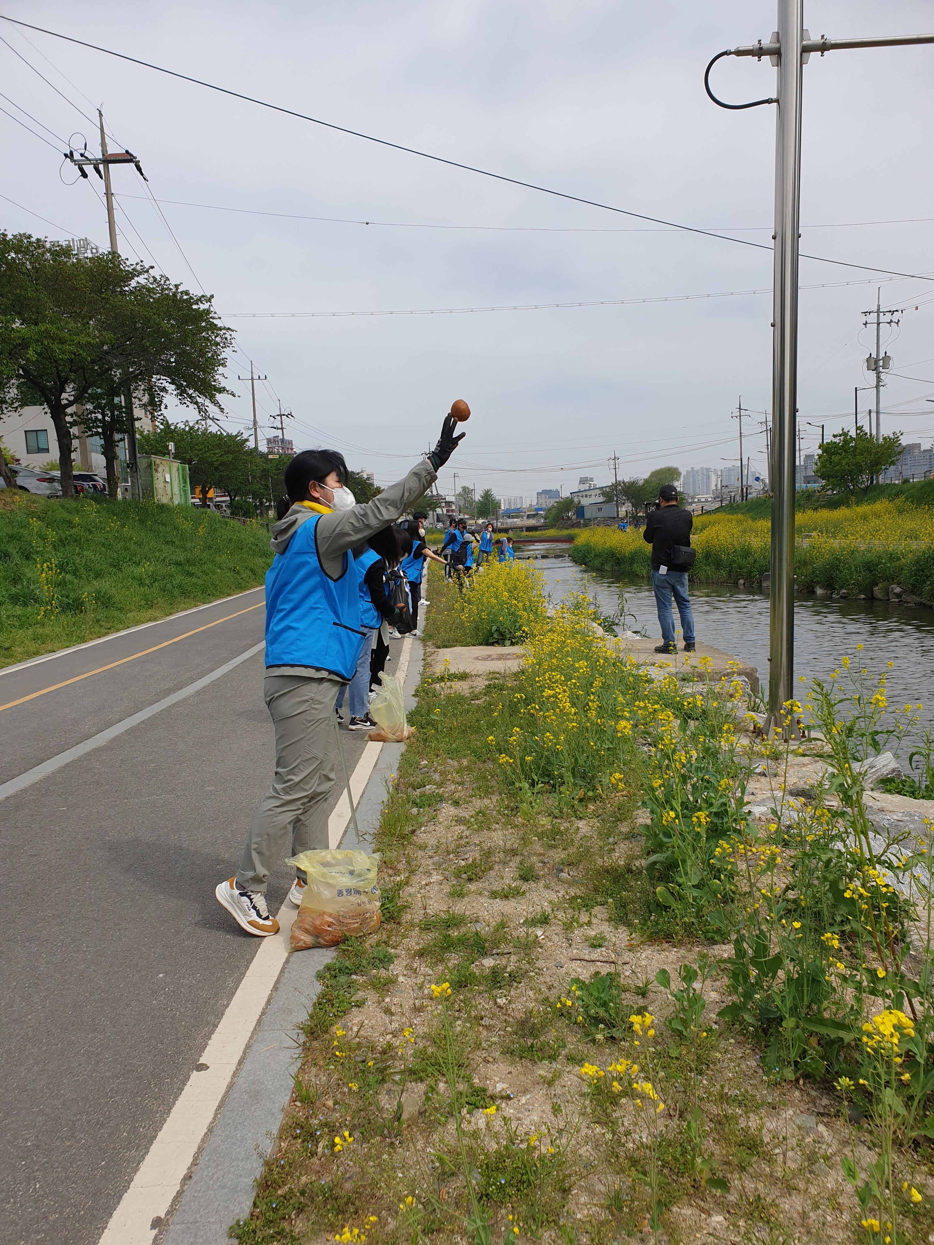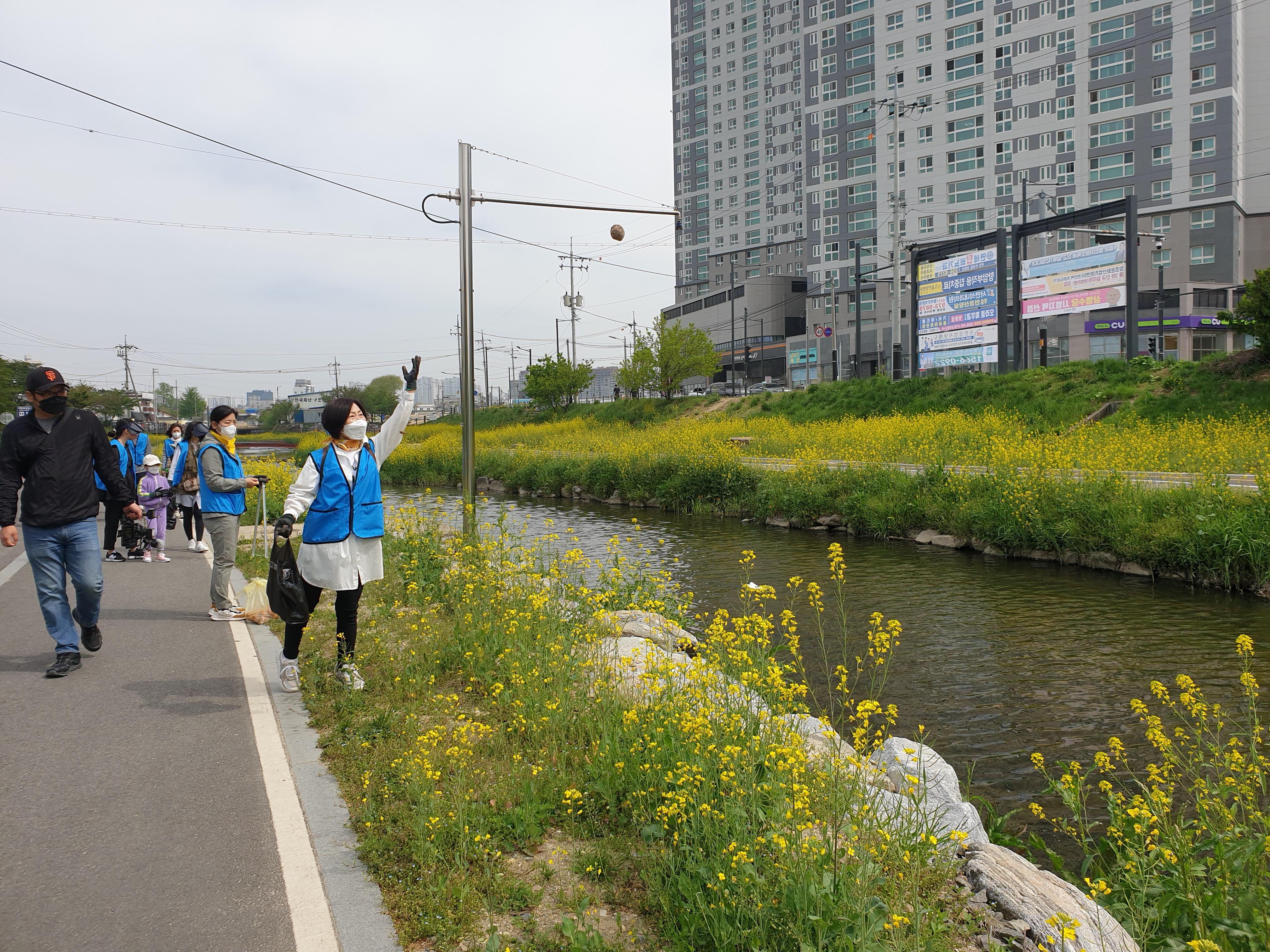 유채꽃이 만발한 천안천에서 지구의 날 기념 수질정화 캠페인 진행했습니다. 하천에 EM흙공을 넣어주고 천변 쓰레기도 주웠습니다.