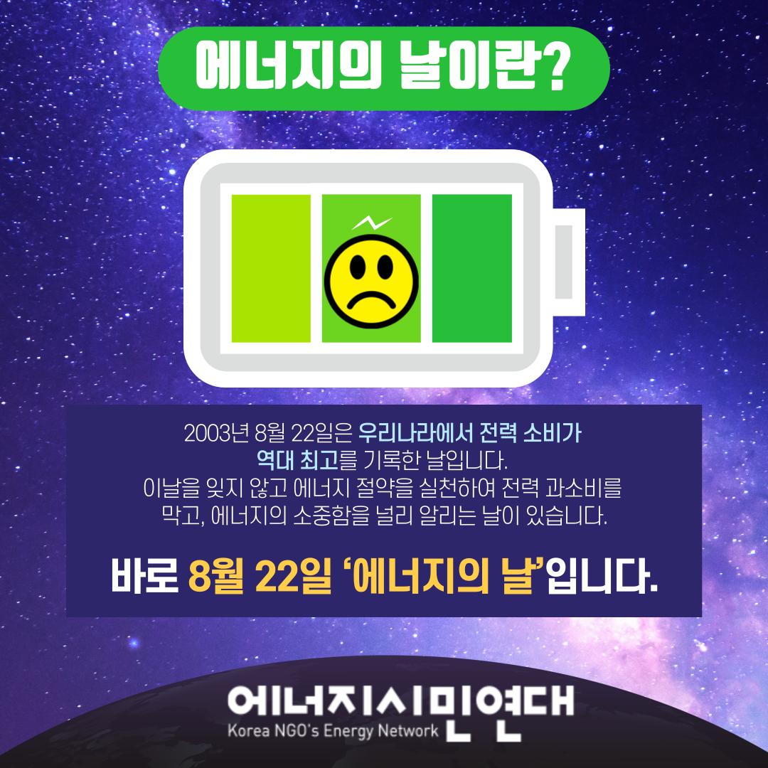 지난 2003년 8월 22일은 그해 국내 전력 소비가 역대 최대였던 날로, 에너지시민연대는 8월 22일을 에너지의 날로 지정하였습니다.