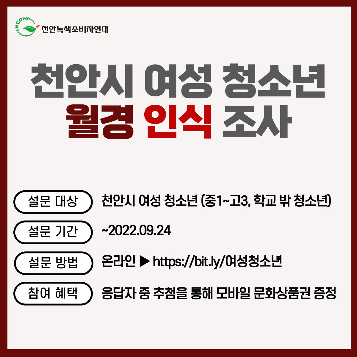 | 천안시 여성 청소년 월경 인식 설문조사지 (0) | 2022.08.23 |