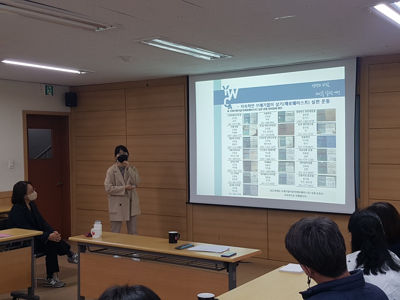 천안YWCA의 자원순환 사례, 광덕산환경교육센터 두더지방앗간의 자원순환 이야기, 사회적협동조합 우리동네의 자원순환 거점 및 환경 활동 사례를 나누는 시간을 가졌습니다.