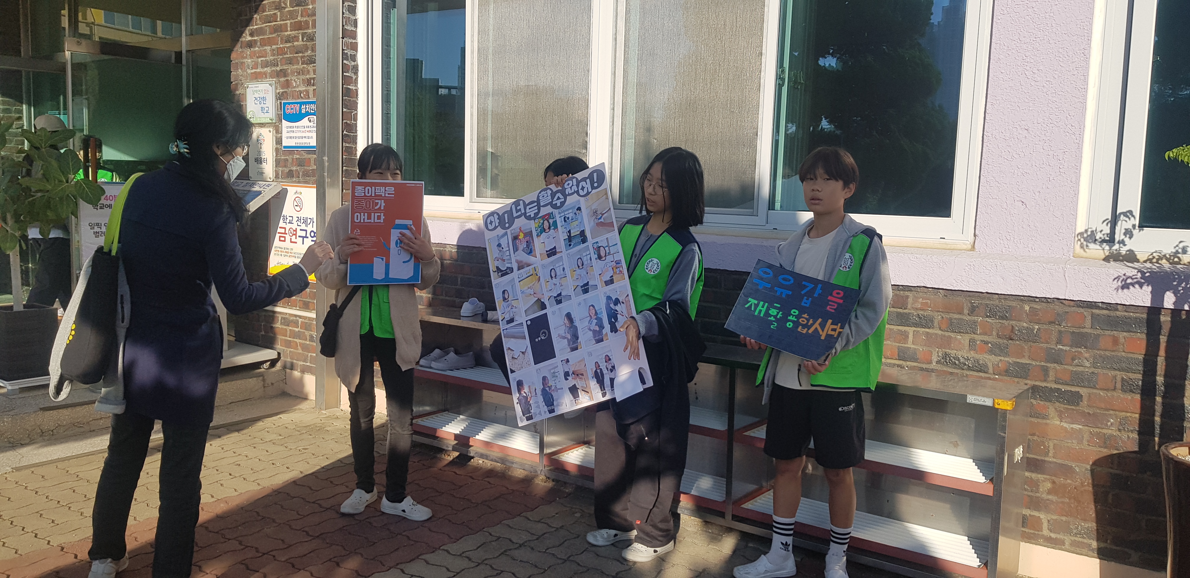 성정초 학생회 친구들과 종이팩은 깨끗하게 헹궈서 펼쳐서 모아줘!!~~라며 캠페인을 진행했습니다!