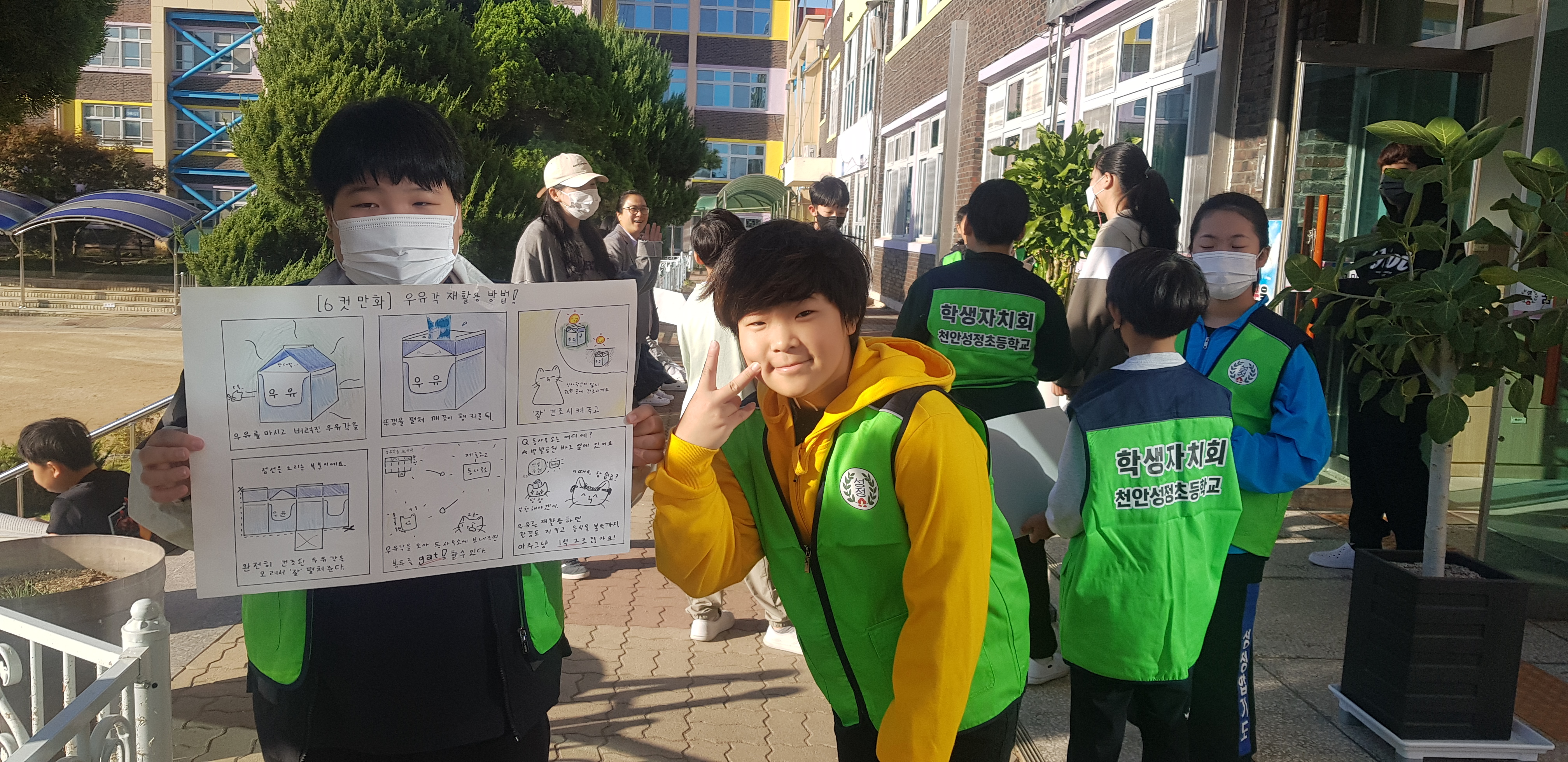 성정초 학생회 친구들과 종이팩은 깨끗하게 헹궈서 펼쳐서 모아줘!!~~라며 캠페인을 진행했습니다!