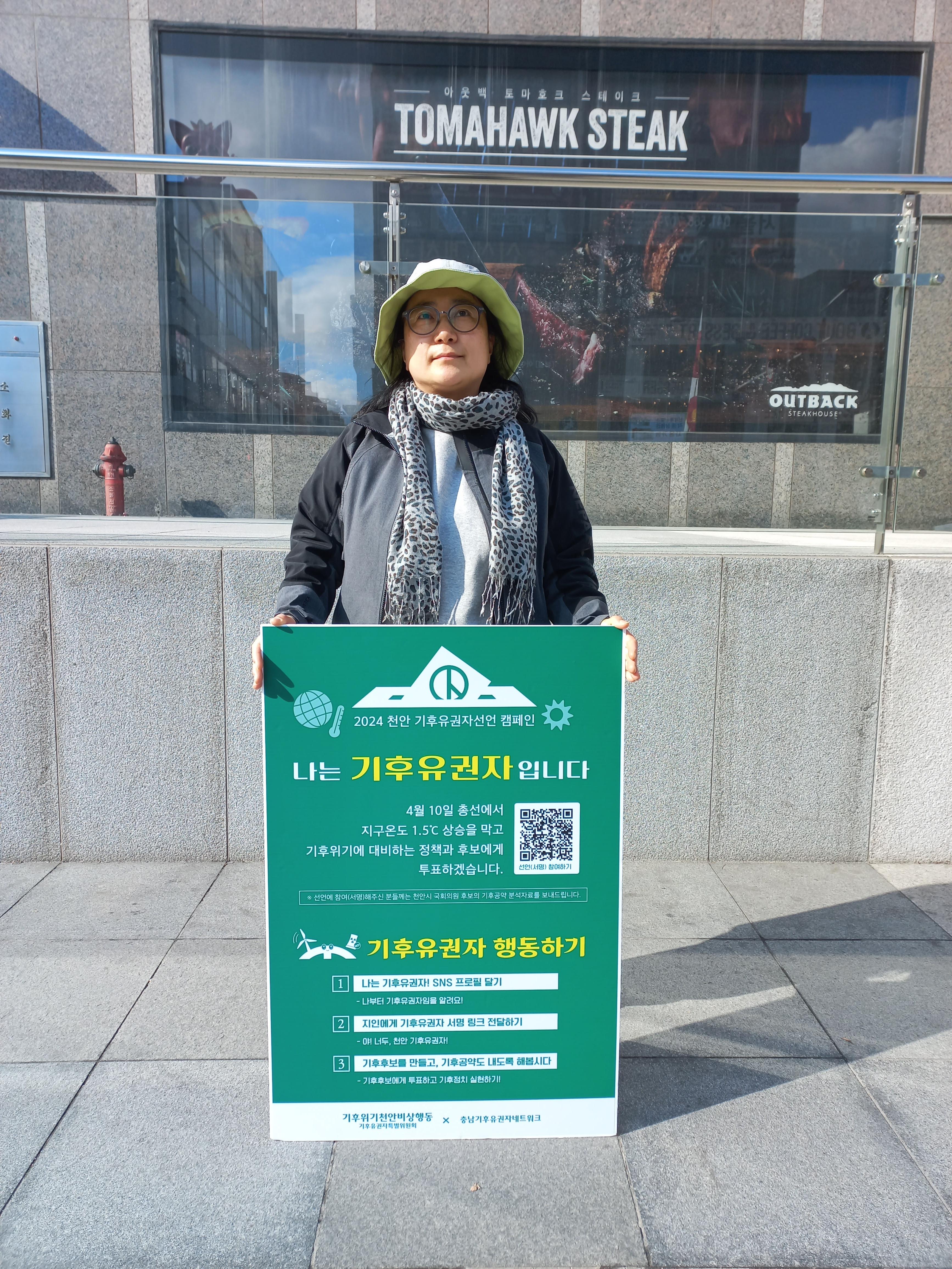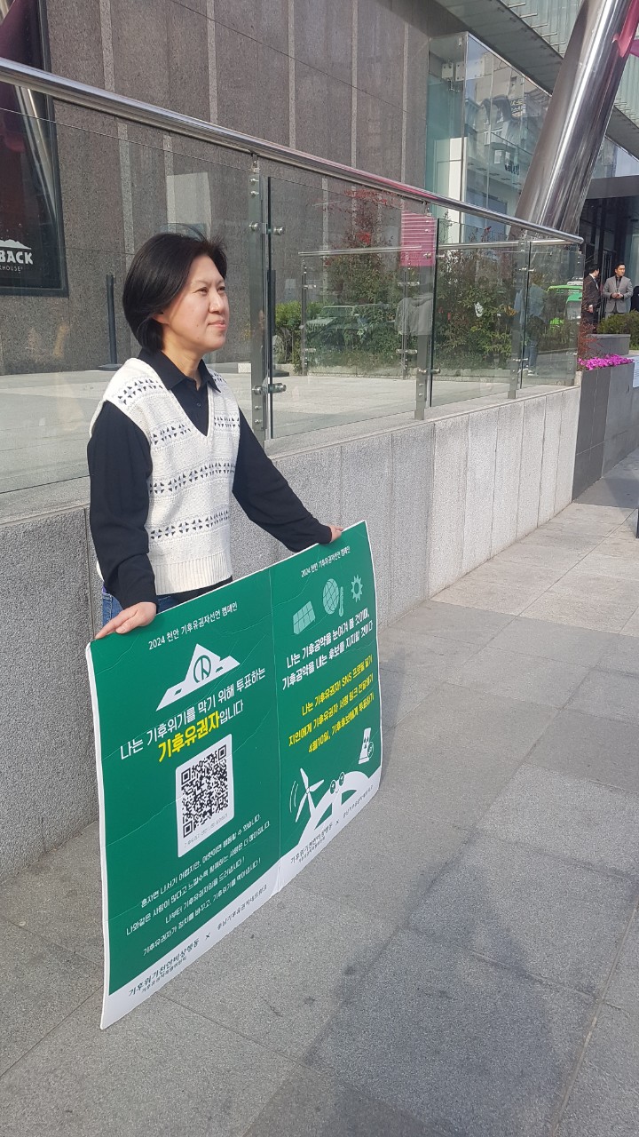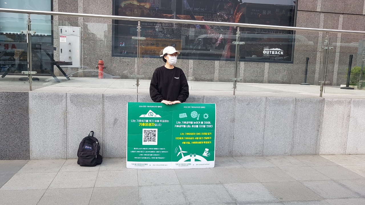 지난주부터 신세계 백화점 충청점 앞에서 기후유권자 릴레이 1인 피켓팅이 진행되고 있습니다. 오는 4월 10일 제22대 국회의원 선거에서 기후위기에 대응할 공약과 비전을 가진 후보에게 한 표를 행사해주세요.