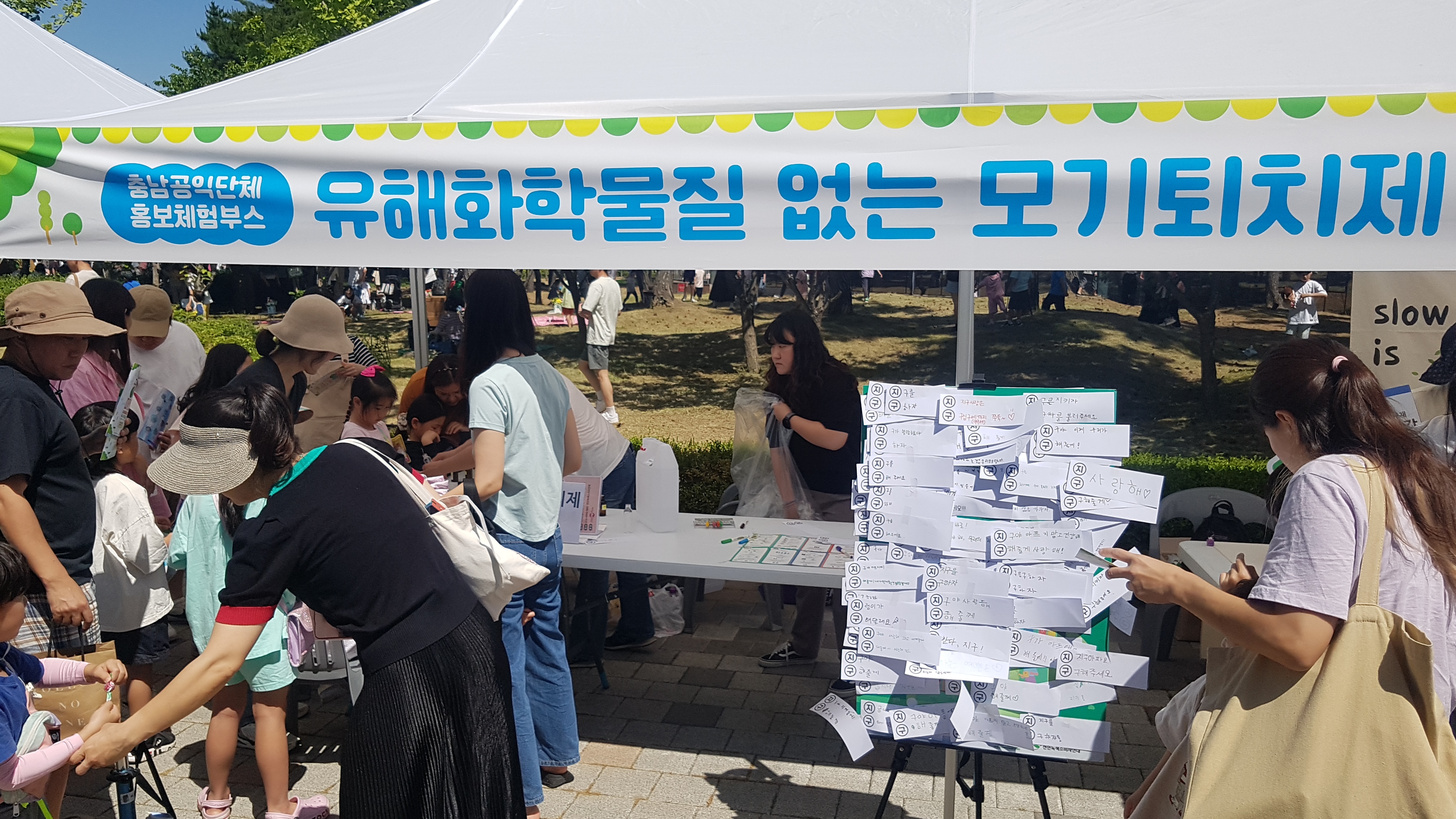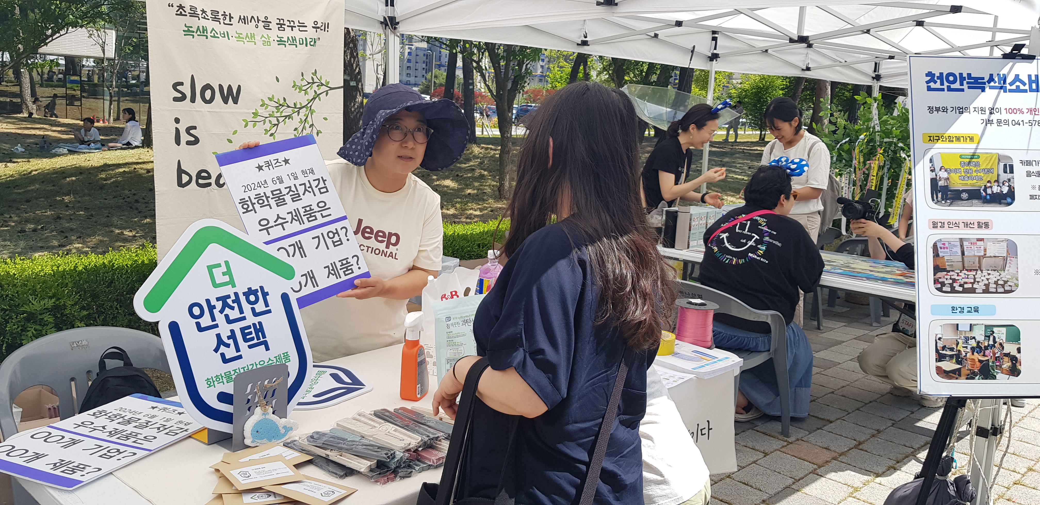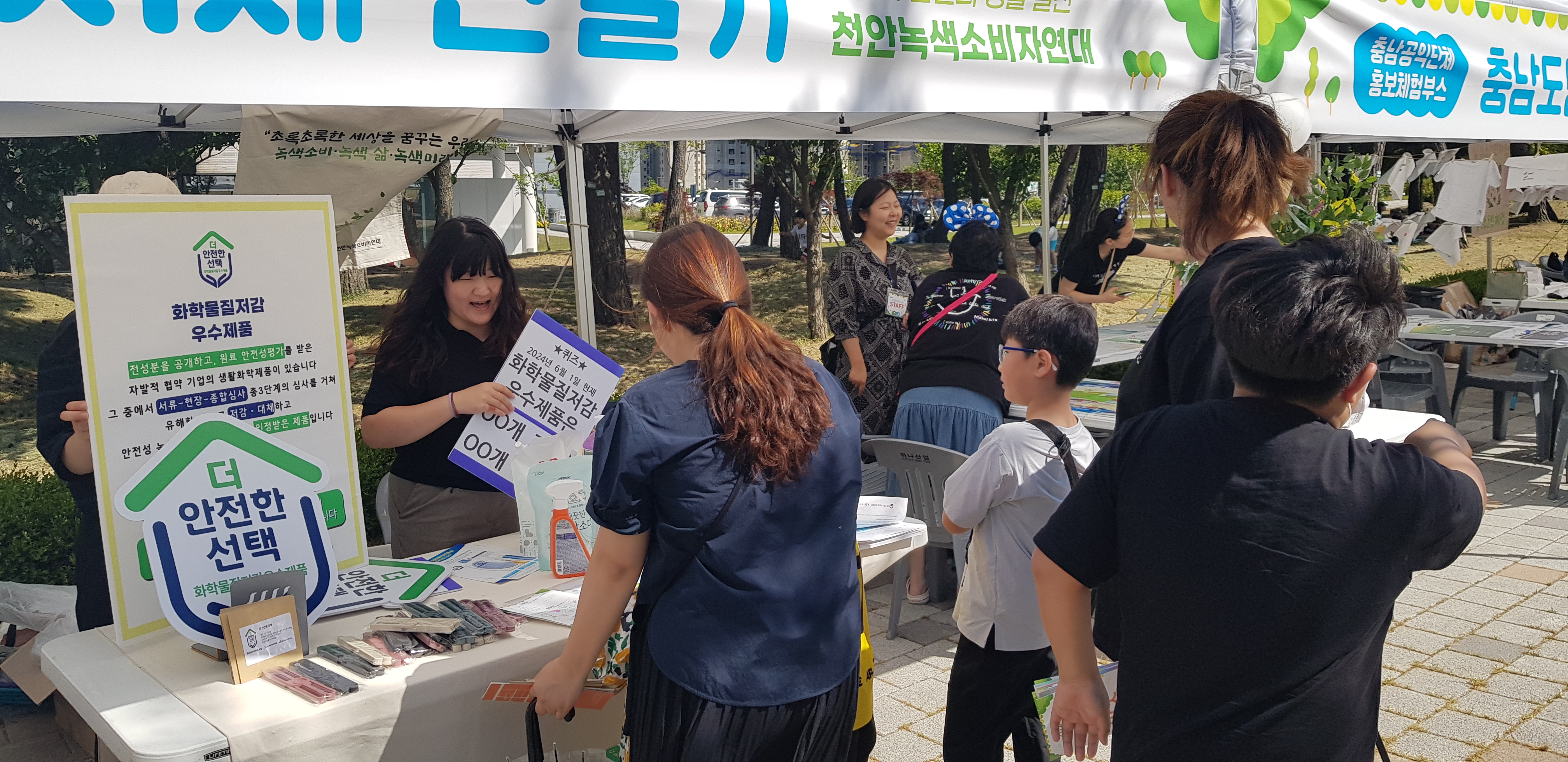 6월 첫 번째 날, 내포에서 열린 <공공마켓>에 부스 참여했습니다. 올해 천안녹색소비자연대는 ‘화학물질과 여성건강’을 주제로 활동하고 있습니다. 이번 부스에서도 유해화학물질 없는 안전한 모기퇴치 스프레이 체험을 진행했습니다. 본격 여름이 다가오는 것을 증명하듯 인기 대폭발! 전성분 공개와 원료 안전성 평가 등을 거친 생활화학제품에 부착되는 ‘화학물질저감우수제품’도 함께 소개했습니다