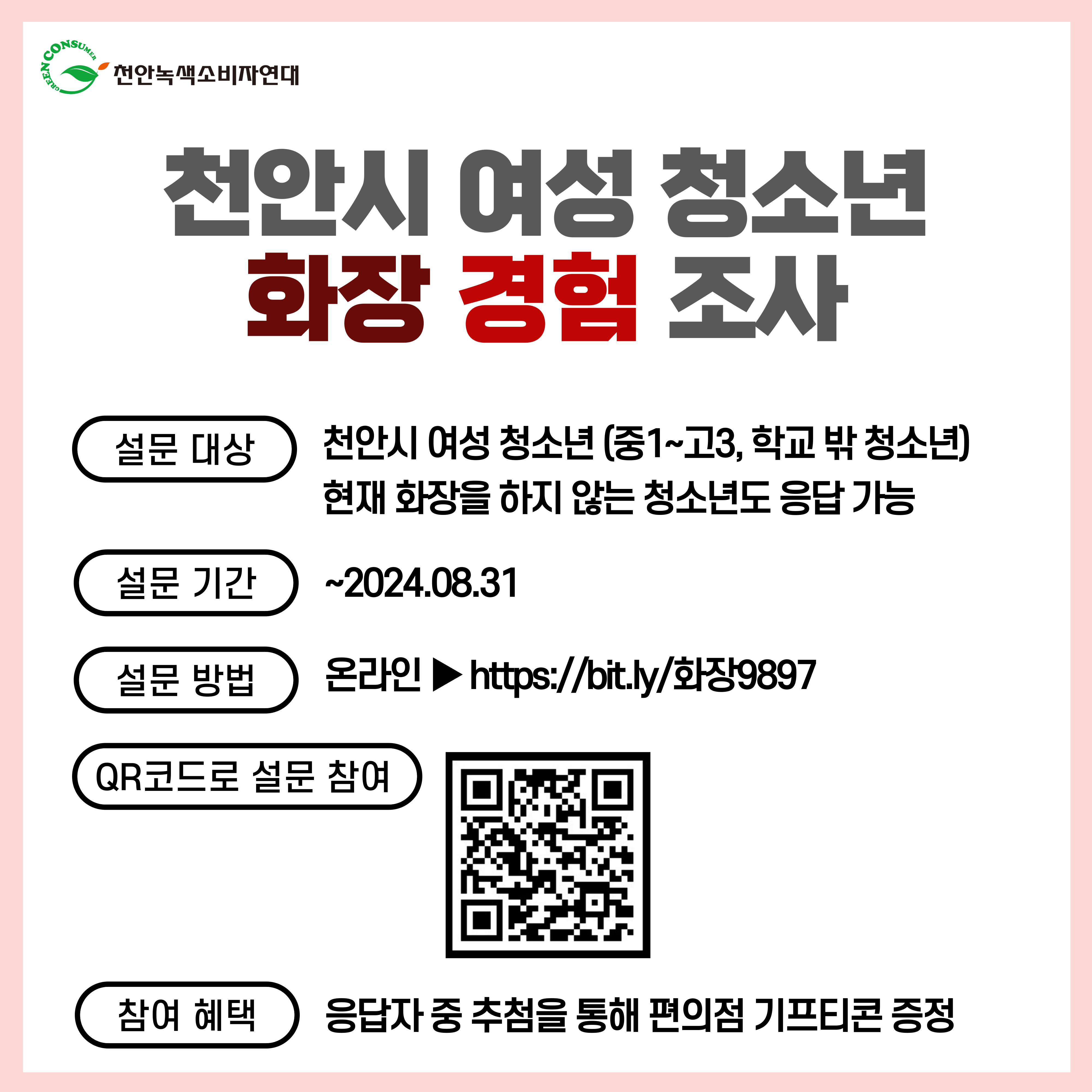 천안녹색소비자연대에서는 '화학물질과 여성건강' 활동의 일환으로 천안시 여성청소년들의 화장 경험을 조사하고 있습니다. 청소년들의 화장품 안전 교육을 위한 참고 자료로 활용될 예정으로, 자녀를 포함한 주변 여성청소년들에게 조사 참여 독려를 부탁드립니다.