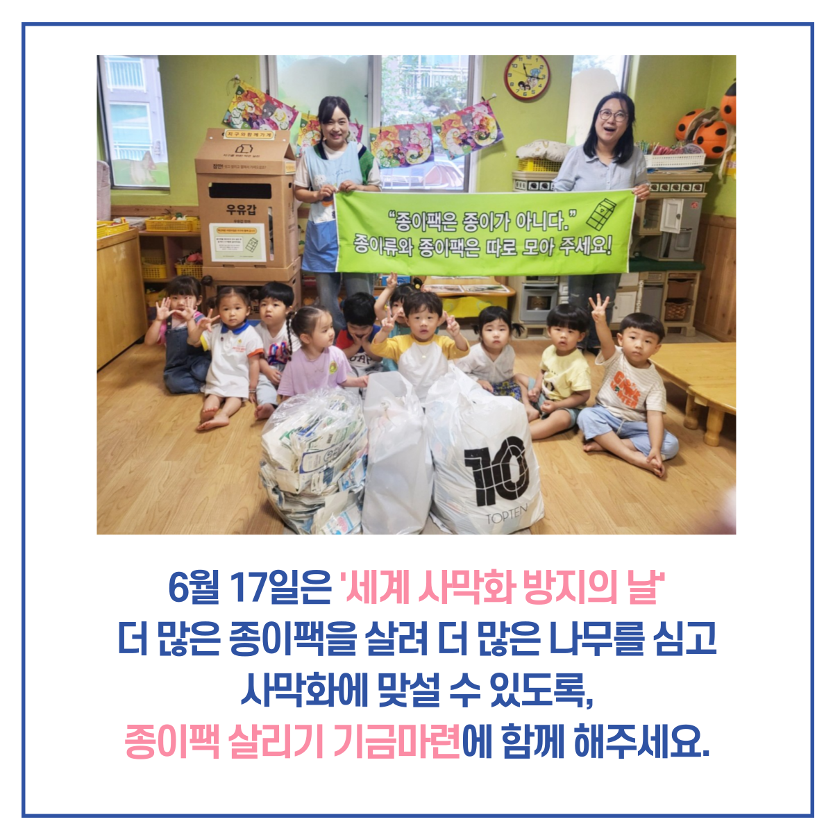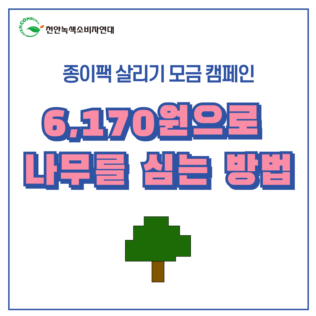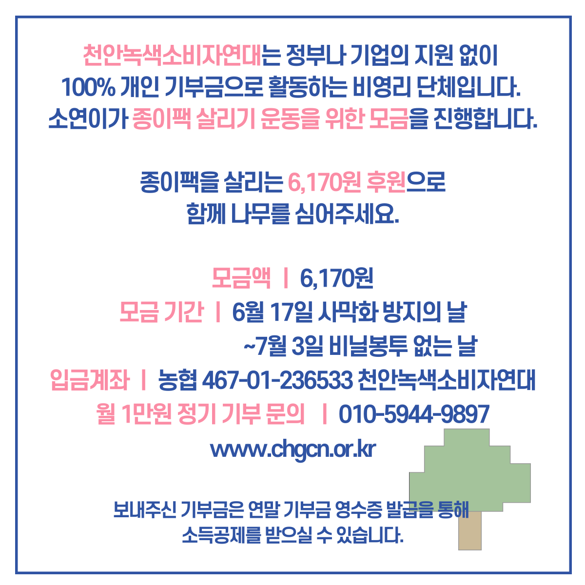 카테고리 없음 종이팩 자원순환 기금마련 모금 <6,170원으로 나무를 심는 방법> by 천안녹색소비자연대 2024. 6. 17. '세계 사막화방지의 날'을 기념하며 천안녹색소비자연대의 대표적인 활동 중 하나인 ‘종이팩 자원순환’ 활동기금 마련을 위해 모금을 시작합니다. 중단 없이 종이팩 수거와 교환에 힘쓸 수 있도록 마음을 모아주세요. 공유하기 게시글 관리 천안녹색소비자연대 저작자표시 (새창열림)