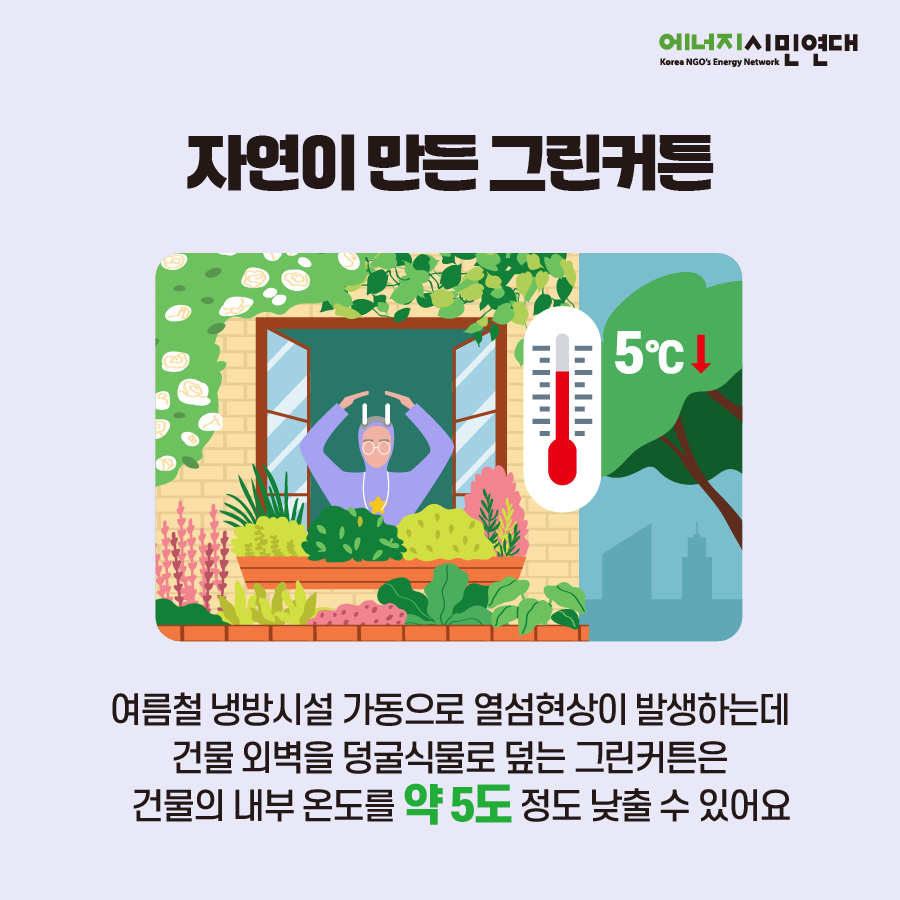 3️⃣건물 외벽을 덩굴식물로 덮는 그린커튼은 건물의 내부 온도를 무려 5도 정도 절감