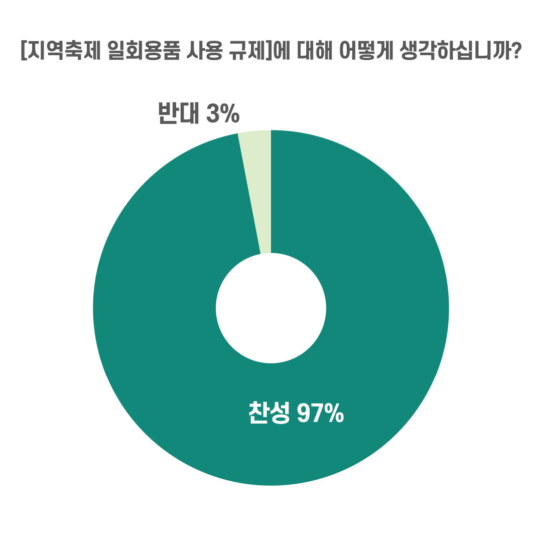 2024 천안흥타령춤축제에 방문한 천안시민을 대상으로 지역축제 쓰레기 문제에 대하여 인식조사를 실시했습니다. 올해는 천안시에서 최초로 푸드존에 [다회용기 서비스]를 도입하여 시민들이 축제 현장에서 직접 다회용기를 사용해보았습니다. 그래서인지 축제 일회용품 사용 규제에 대한 찬성 비율은 97%로 지난 5월 K-컬처 박람회 때의 89%보다 높습니다.