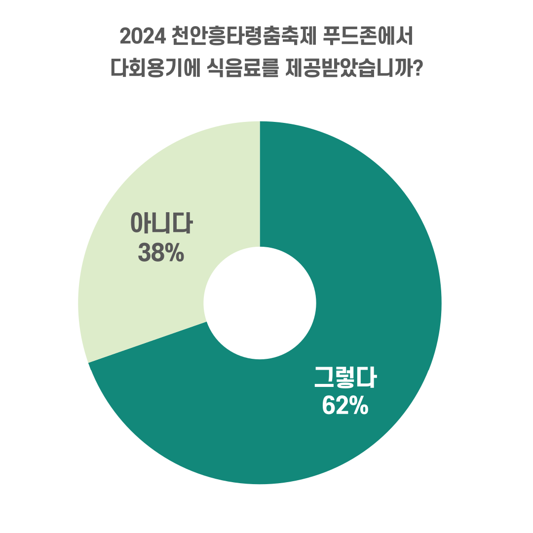 2024 천안흥타령춤축제에 방문한 천안시민을 대상으로 지역축제 쓰레기 문제에 대하여 인식조사를 실시했습니다. 올해는 천안시에서 최초로 푸드존에 [다회용기 서비스]를 도입하여 시민들이 축제 현장에서 직접 다회용기를 사용해보았습니다. 그래서인지 축제 일회용품 사용 규제에 대한 찬성 비율은 97%로 지난 5월 K-컬처 박람회 때의 89%보다 높습니다.