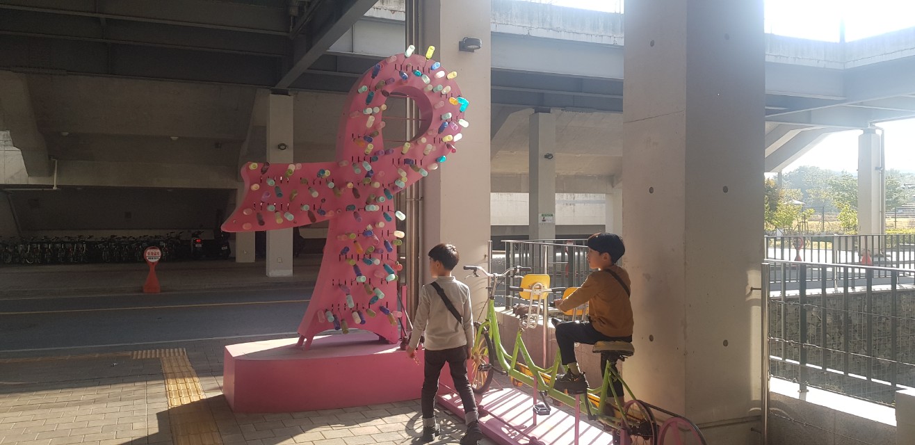 서울녹색구매지원센터를 방문해 환경문제를 해결하기 위한 녹색소비와 녹색구매의 중요성에 대해 알아본 후 도슨트 투어를 시작했습니다. 병뚜껑, 종이팩, 비닐, 천막천, 유리병, 폐의류 등 다양한 소재의 쓰레기들의 멋진 탈바꿈을 목격했습니다.
