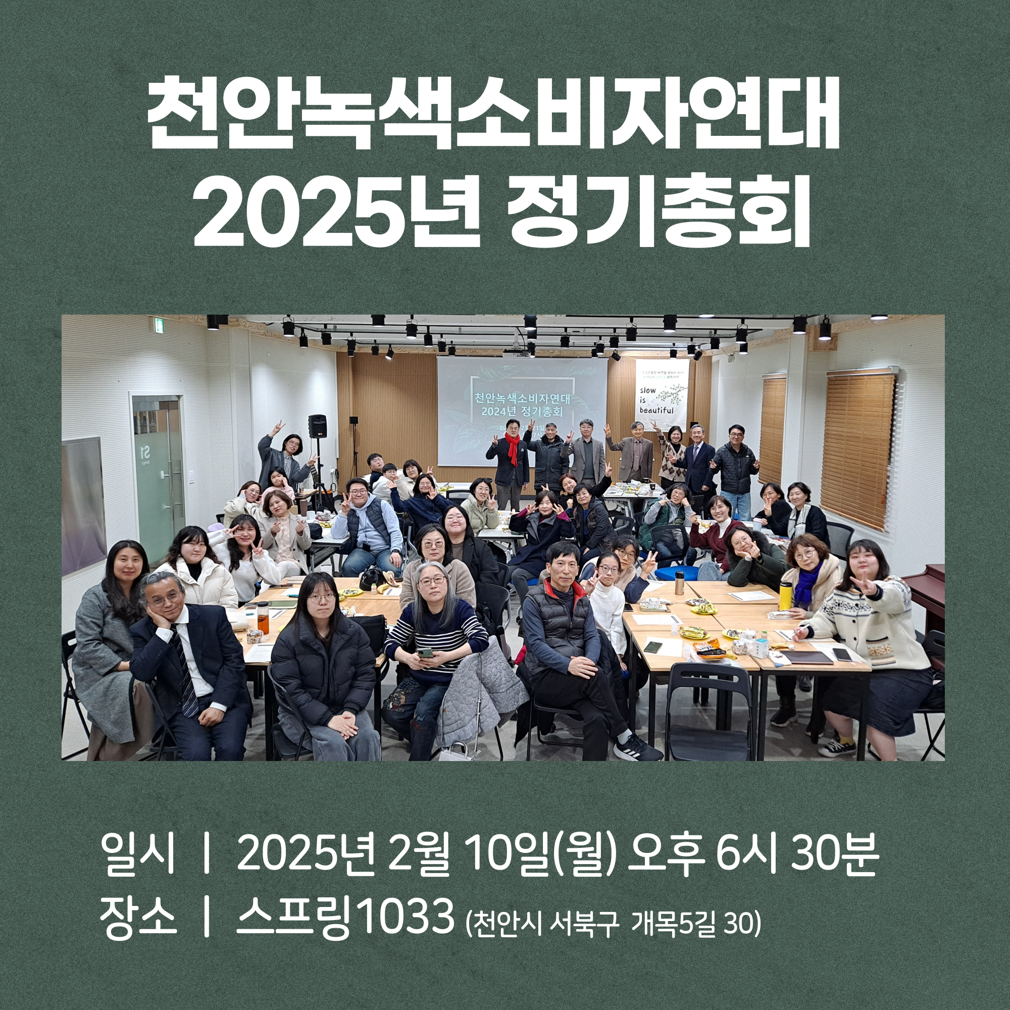 천안녹색소비자연대는 개인 기부금으로 운영되는 비영리 단체이고 매년 1회 정기총회를 통해 기부자님들과 만납니다. [회의] 할 때 [회]자가 들어가지만 대단히 심각한 이야기를 하는 시간은 아닙니다. 참여 경험이 있는 분들은 아시겠죠?