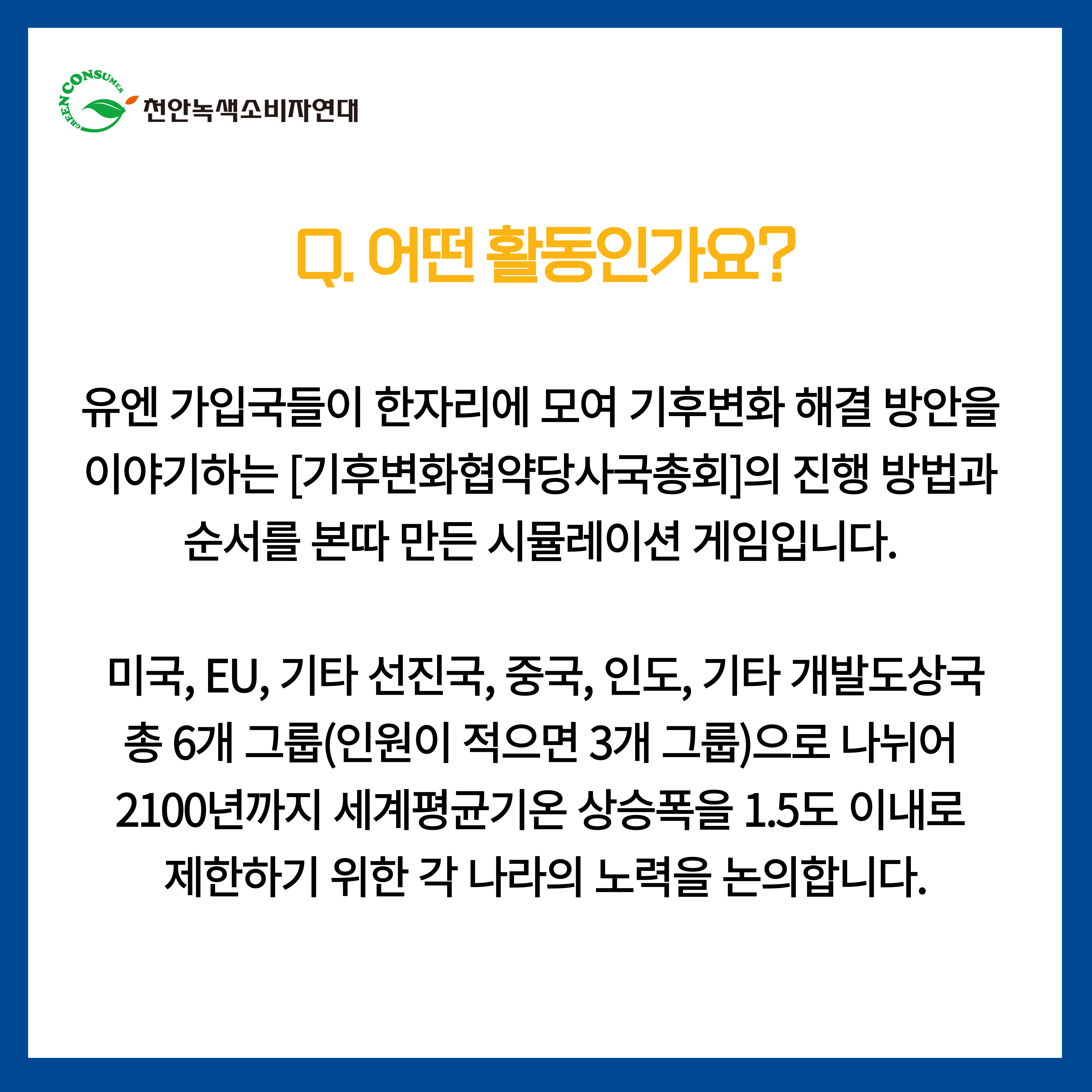 기후변화협상 시뮬레이션은 10명~15명 사이의 그룹으로 함께 합니다. 관심 있는 동아리, 모임 등 시민들의 관심과 참여를 기다립니다.