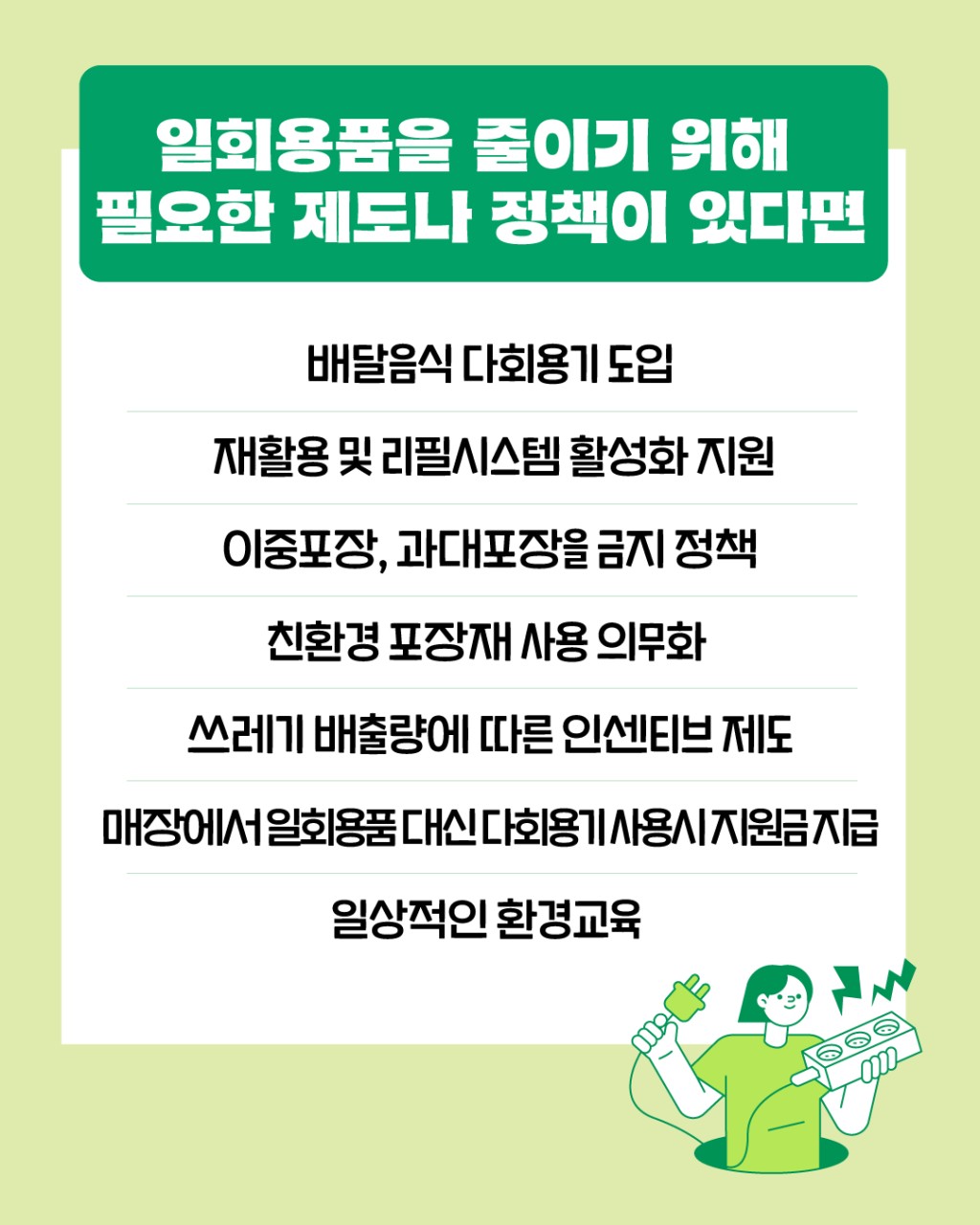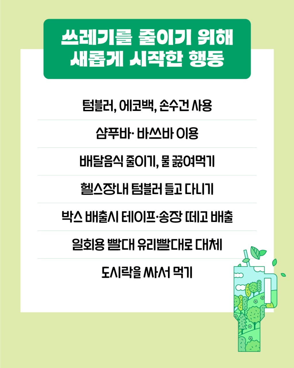 대학생들은 일상에서 주로 어떤 쓰레기를 배출하고 있는지, 쓰레기를 줄이기 위해 어떤 노력을 했는지, 그리고 자원순환이 되기 위해서는 어떤 제도가 필요하다고 느꼈는지 다양한 의견들을 정리해 보았습니다.