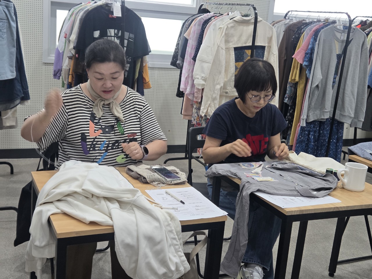 각자 가져온 옷들을 펼치고 바느질할 옷감을 진지하게 선택하여 바느질 시작.