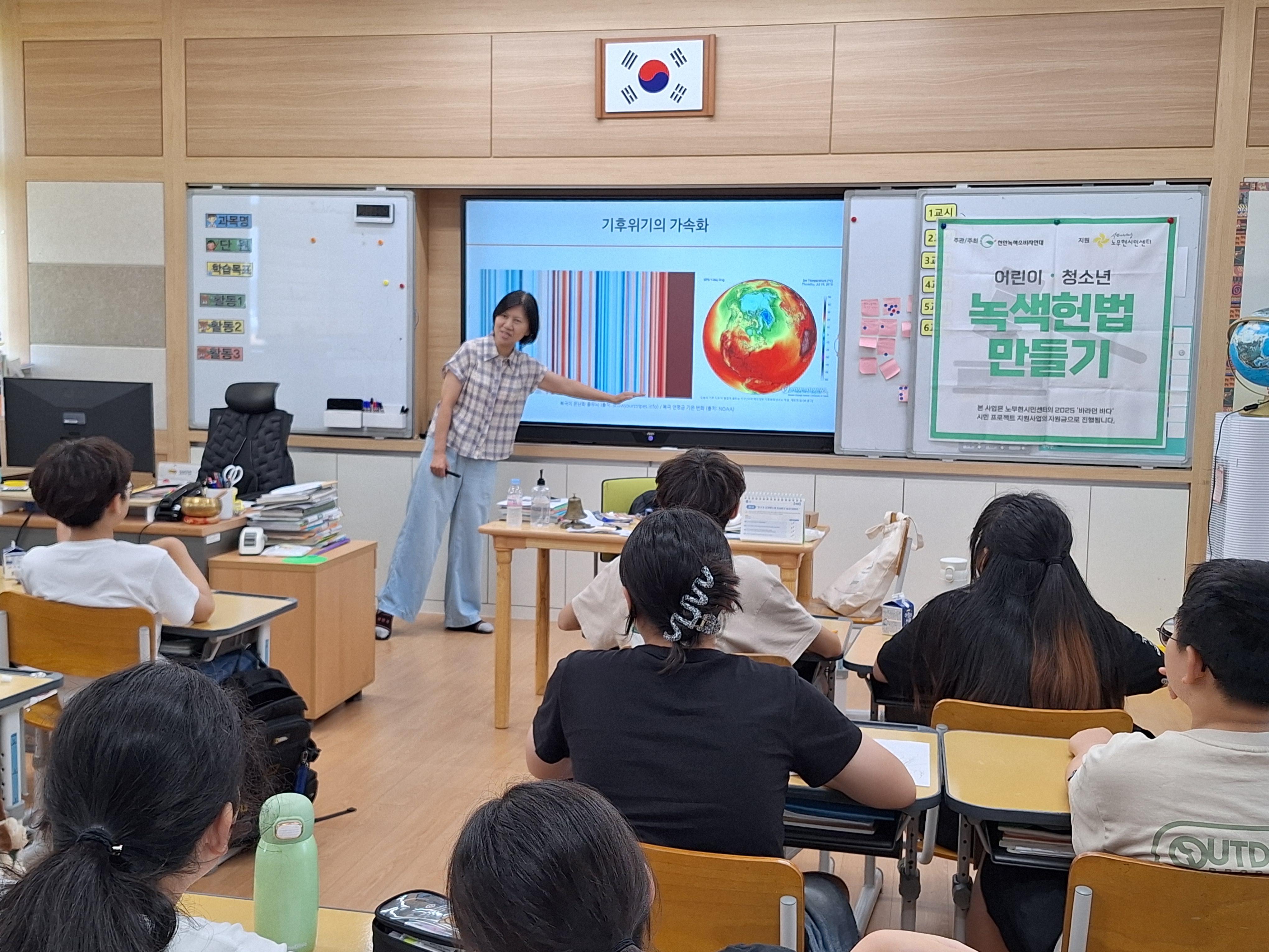 어린이가 만드는 녹색헌법, 더워도 너무 더운 여름 개학과 함께 수신초등학교에서 진행되었습니다. 수신초등학교는 전교생이 총 28명인 작은 학교인데 오늘은 6학년 11명, 5학년 2명 총 13명이 참여했습니다.