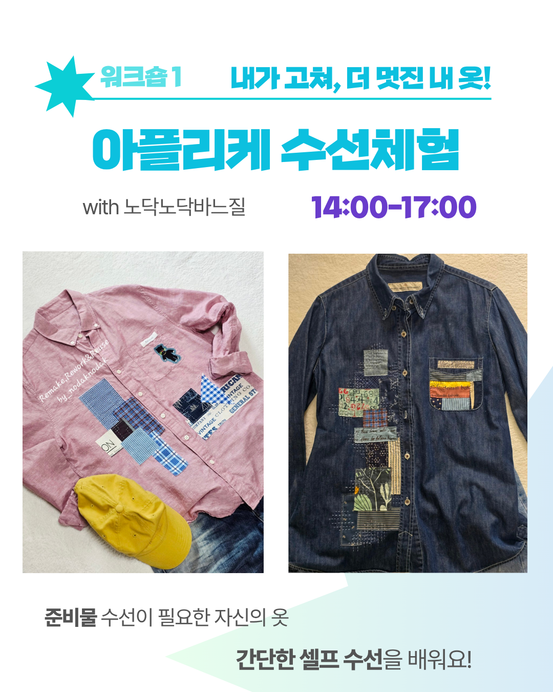 옷 교환 파티, 아플리케 체험, 다닝스티치 체험, 청바지 브로찌 만들기 체험, 천연보습립밥 만들기, 설거지바 만들기, 체험 등 다양한 체험거리들이 함께 합니다.