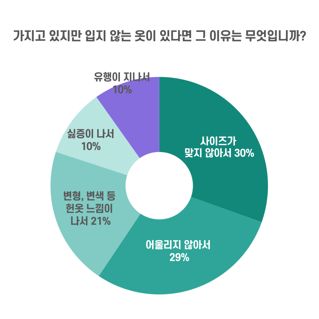 설문 결과 입지 않는 옷을 처리하는 방법에 대해서 응답자 과반은 헌옷 수거함을 이용하고 있었고 입지 않아도 계속 소유한다는 응답도 28%로 나타났습니다. 반면 기부나 재판매 등으로 순환한다는 응답은 13%에 그쳤습니다. [일상적으로 옷을 교환하는 가게(행사)가 있다면 참여할 의사가 있다]는 답변이 66%로 나온 것과 대비됩니다. 의류 수선 교육 욕구도 높게 나타난 만큼 자원순환에 관심 있는 지역 단체와 연대하여 중고 의류를 교류하고 수선하는 의류 순환 플랫폼을 구축할 예정입니다.