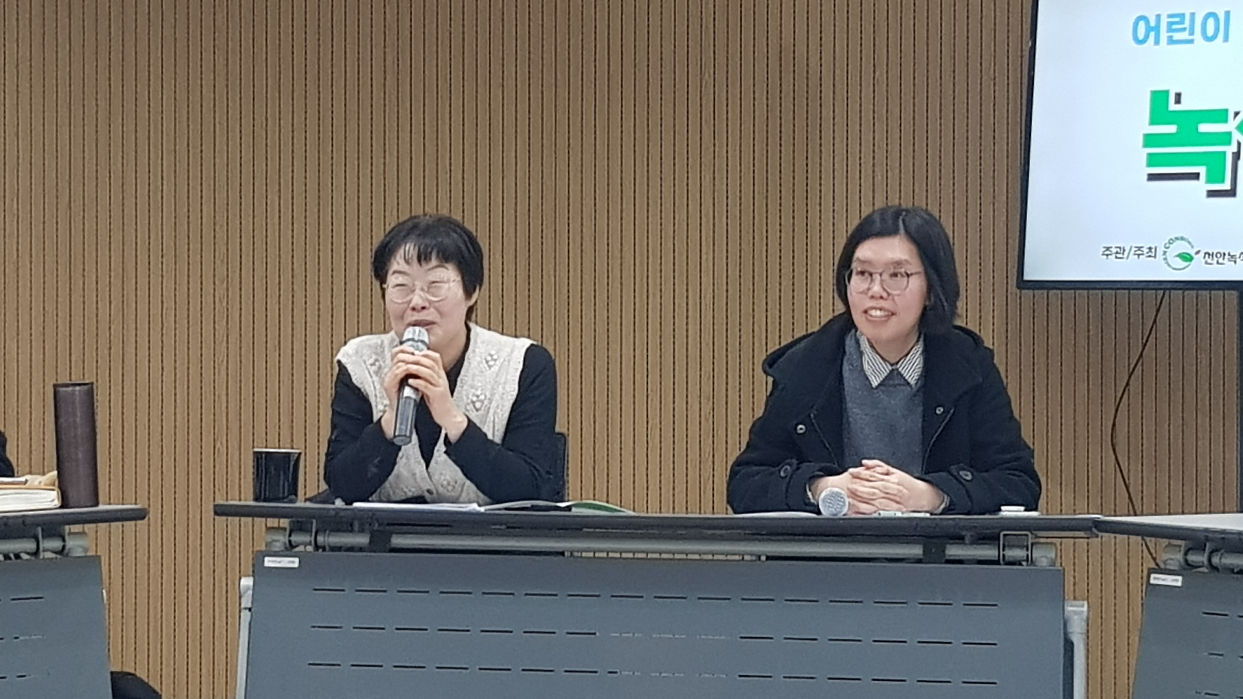 김맹순 원장(모여라공동육아어린이집)은 어릴적부터 환경과 친숙한 것이 중요하며 생태적 감수성을 키우는 교육을 지속적으로 진행할 것을 제안하였다. 윤성원 선생님(성성초등학교 교사)은 환경교육을 하면 개인의 실천으로 마무리되며 개인의 책임으로 환경문제가 전가되는 경향이 있는데 녹색헌법 만들기처럼 개인의 실천을 넘어 필요한 정책에 대한 논의가 필요하다고 발언하였다. 인혜진 학부모의 경우 아이들이 학교에서 뿐만 아니라 가정까지 연결한 실제적인 환경실천의 필요성을 강조하였다. 김민하 선생님(천안고등학교 교사)은 청소년의 경우 기후위기에 대한 교육의 기회가 많지 않기 때문에 이론 교육 뿐만 아니라 실제적으로 행동으로 연결할 수 있는 대안이 필요하다고 이야기 하였다. 박은순 사무국장(천안KYC)은 어린이 청소년뿐만 아니라 청년(성인 포함) 대상 환경교육의 필요성과 로컬푸드, 건강한 먹거리 등 청년의 삶과 연결된 정책 개발도 필요하다고 발언하였다.