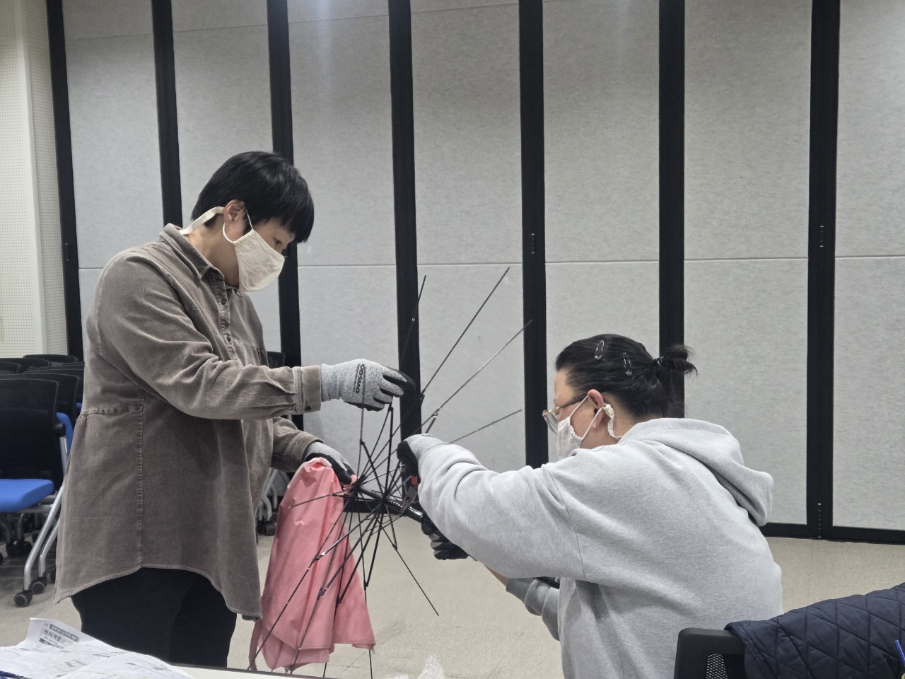 모아준 우산 중 사용 가능한 우산도 골라내고 수리 가능한 우산도 모아두고 수리가 불가능한 우산은 부품으로 따로 해체하였습니다.