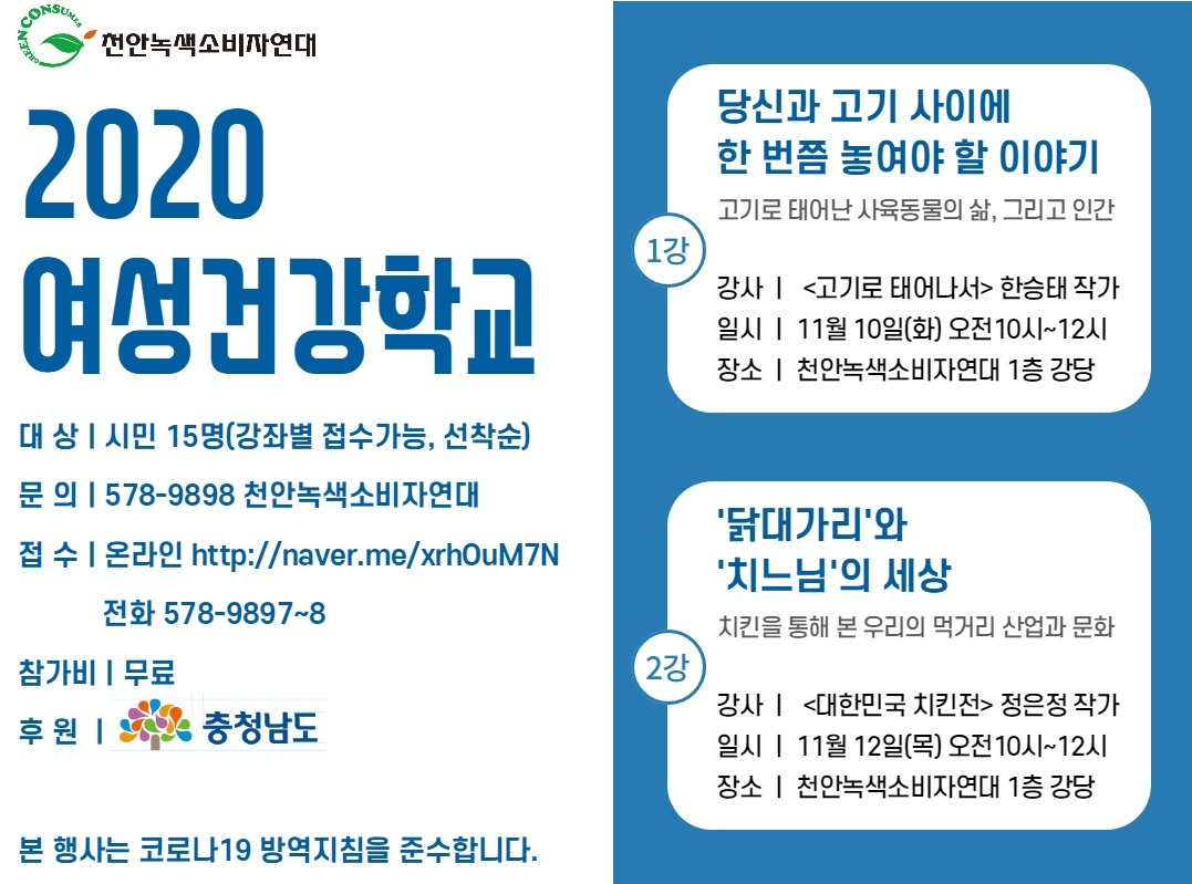 매년 상반기에 찾아뵀었죠. 올해는 늦가을에 준비했습니다. 천안녹색소비자연대 2020 여성건강학교를 진행합니다.