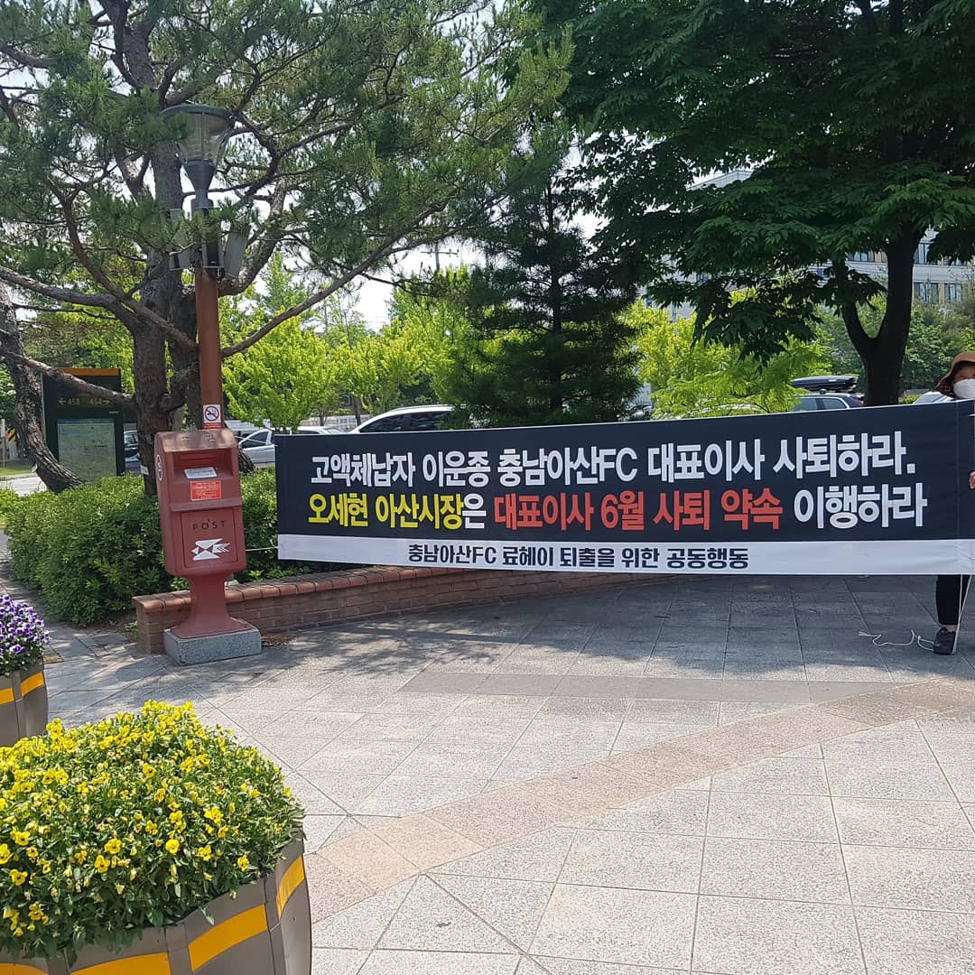 충남 도내 50여개 시민사회단체로 구성된'충남아산FC 료헤이 퇴출을 위한 공동행동'은 료헤이 즉각 퇴출을 위한 활동을 이어왔습니다. 그리고 충남아산FC는 지난 5월 31일 발표한 쇄신안에 료헤이와의 계약 종료 내용을 명시했습니다. 그러나 발표된 쇄신안에는 이 사태를 만들었던 책임자에 대한 조치는 빠져있습니다. 이에 공동행동은 이운종 대표이사의 사퇴와 아산시민 및 충남도민을 향한 진심어린 사과를 거듭 촉구하는 피켓팅 시위를 이어가고 있습니다.
