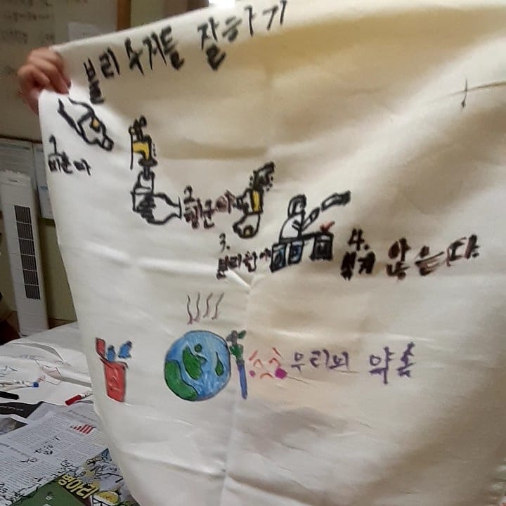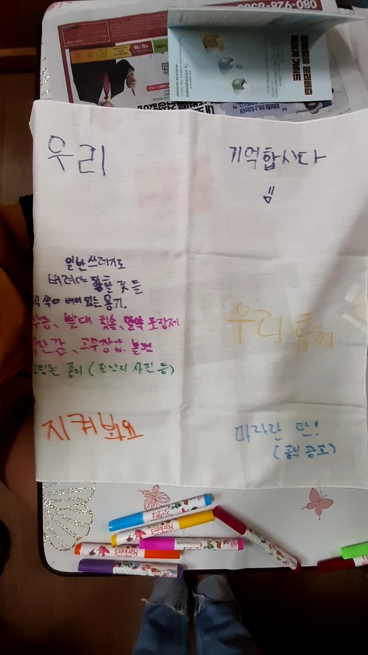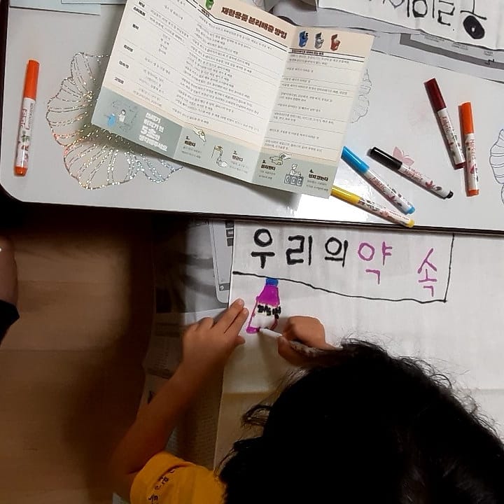 햇살가득파랑새지역아동센터 환경교육 진행했습니다. 오늘은 그간 배운 분리배출 방법을 정리해보는 시간을 가졌습니다. 보자기에 섬유펜으로 분리배출 4원칙을 그려 넣었답니다. 오늘 만든 분리배출 보자기는 이웃에게 선물할 제로웨이스트 물품을 포장하는 용도로 사용됩니다.