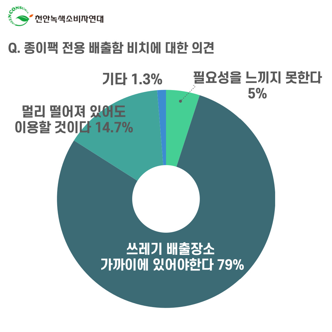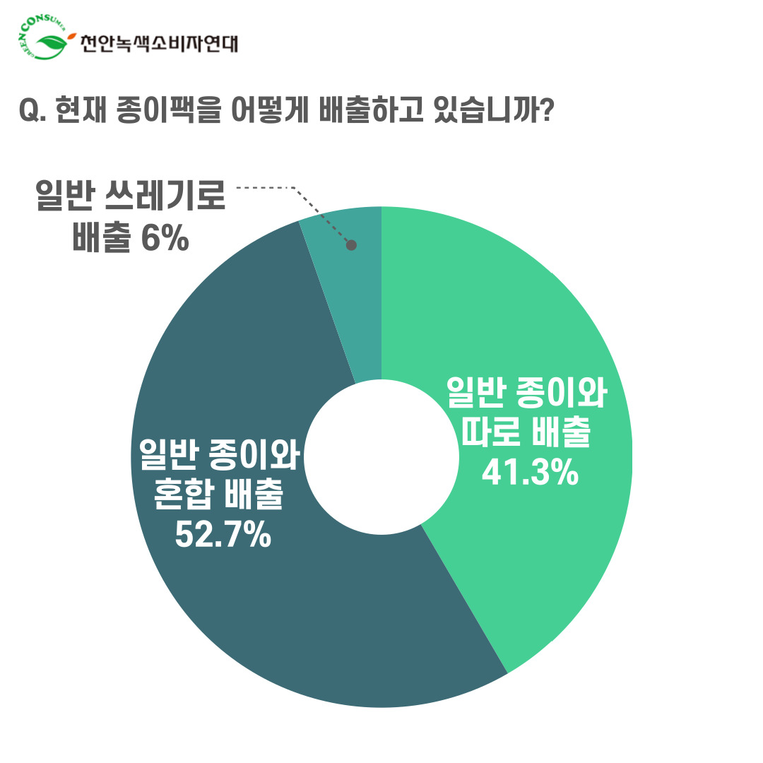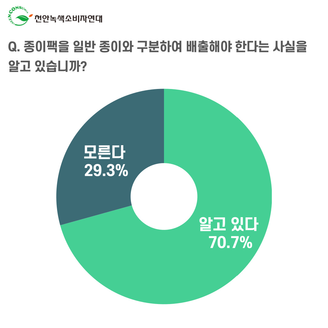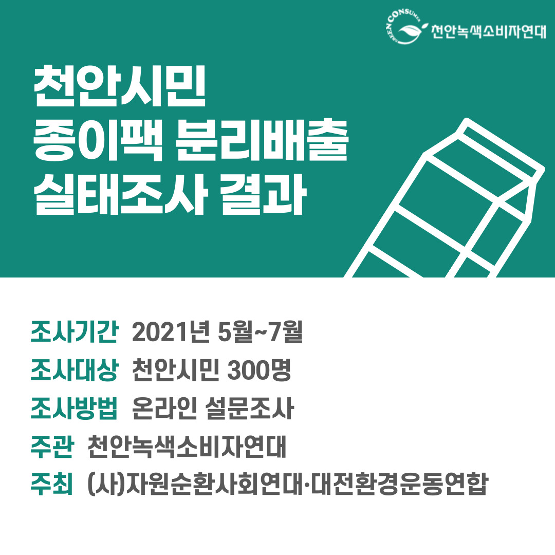 □ 종이팩은 고급 펄프로 제작된 재활용 자원으로서 플라스틱(PE) 코팅이 되어있어 반드시 일반 종이와 별도로 배출해야 한다. 천안녹색소비자연대는 가정의 종이팩 분리배출 실태를 파악하고 그 개선안을 모색하기 위해 2021년 5월부터 7월까지 천안시민 300명을 대상으로 ‘종이팩 분리배출 실태조사’를 온라인으로 진행하였다. 본 조사는 천안녹색소비자연대가 주관하고 (사)자원순환연대, 대전환경운동연합[2021년 환경부지원사업]이 주최하는 ‘종이팩⋅아이스팩 분리배출 수거시스템 구축 사업’의 일환이다.