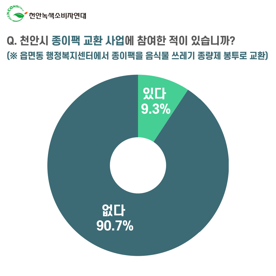 □ 또한 천안시가 지역의 종이팩 재활용 활성화를 위해 진행하고 있는 ‘종이팩 교환사업’은 시민 홍보와 참여가 절대적으로 부족한 것으로 보인다. 응답자의 27%만이 해당 사업을 알고 있었으며 실제로 행정복지센터에 방문해 종이팩을 음식물쓰레기 종량제 봉투로 교환받은 적이 있다는 응답자는 300명중 28명으로 10%도 되지 않는다.