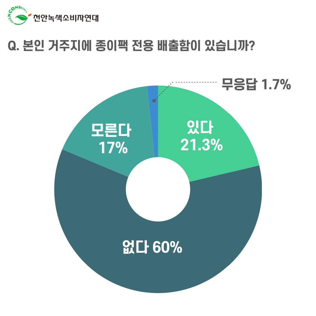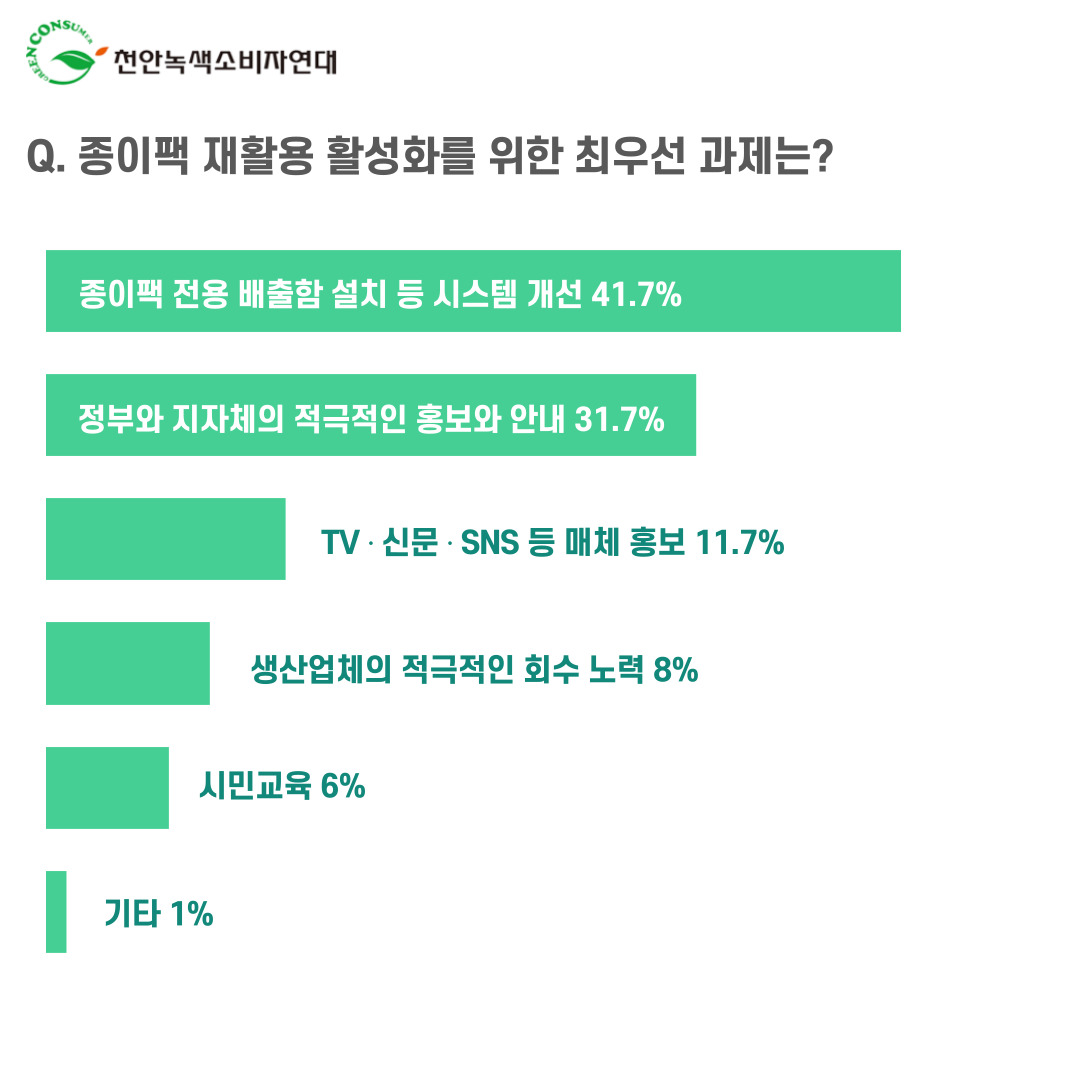 | 천안녹색소비자연대, 천안시민 300명 대상으로 종이팩 분리배출 실태조사 실시 - <종이팩과 일반 종이를 따로 배출해야한다는 것을 알고 있다> 70.7%, <종이팩과 일반 종이를 따로 배출하고 있다> 41.3% - <거주지 재활용 배출함이 종이팩과 일반 종이를 함께 배출하게 되어있기 때문에 혼합 배출 한다> 51.3% -<거주지에 종이팩 전용 배출함이 없다> 60% -<종이팩 분리배출 활성화 최우선 과제는 종이팩 전용 배출함 설치> 41.7% -<천안시 종이팩 교환사업을 알고 있다> 27% -<천안시 종이팩 교환사업에 참여한 적이 있다> 9.3% |