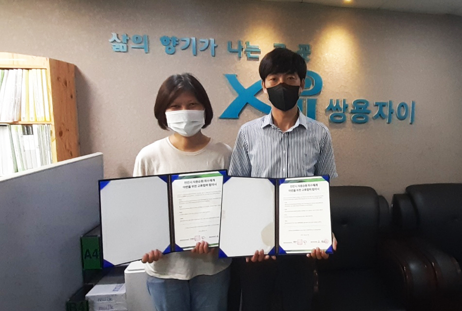 쌍용자이아파트와 종이팩⋅아이스팩 분리배출 수거시스템 구축을 위한 협약식을 가졌습니다. 청당벽산블루밍 아파트와 마찬가지로 쌍용자이 아파트 역시 단지 내 수거 활동, 입주민 대상 캠페인 등을 진행할 예정입니다.