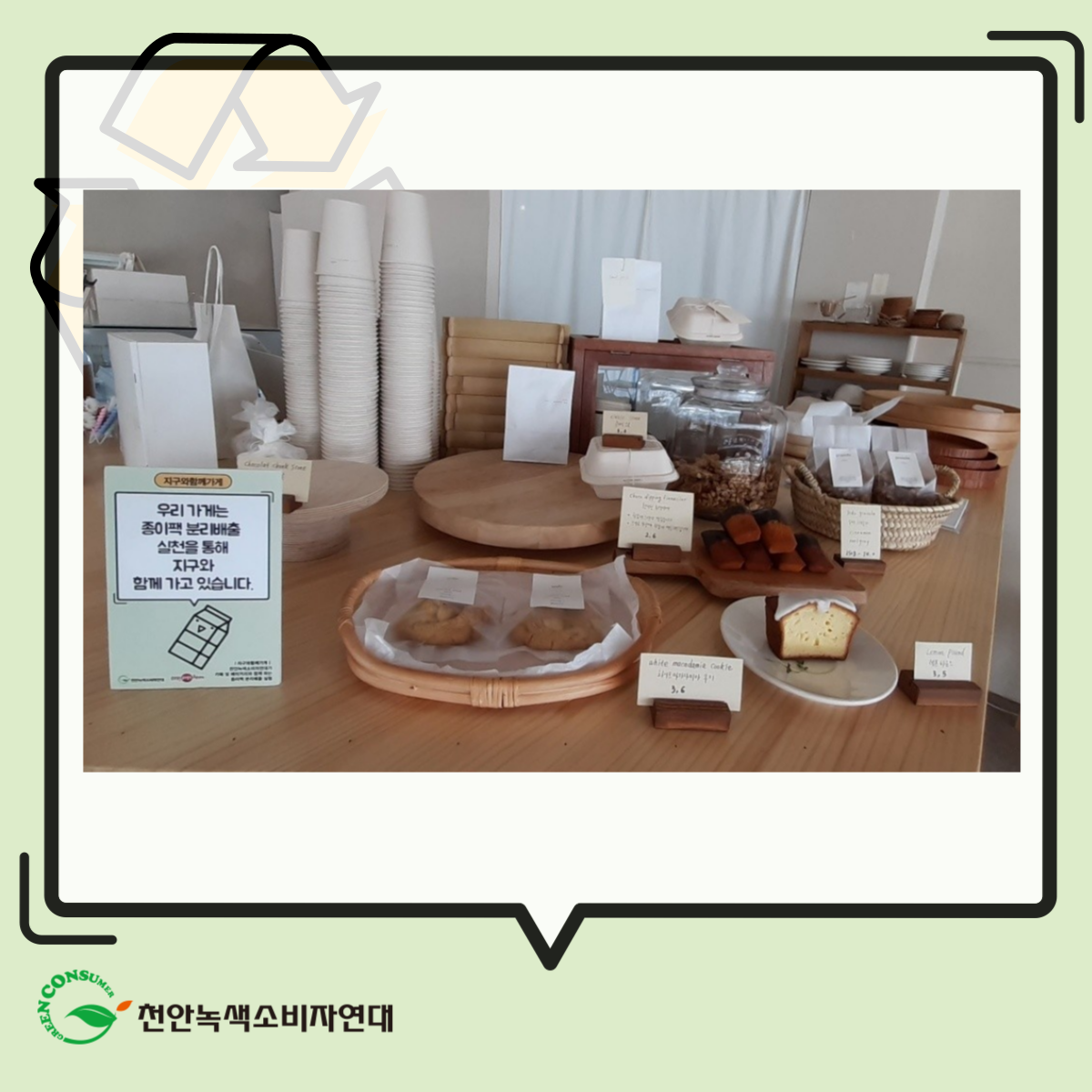천안녹색소비자연대와 함께 다양한 활동을 함께 하고 있는 제로웨이스샵 ‘푸른별 상점’의 바로 옆에 위치해있습니다. 인연이 또 이렇게 이어지는 거겠죠? 주문제작하는 레터링 케이크가 어여쁜 카페입니다.