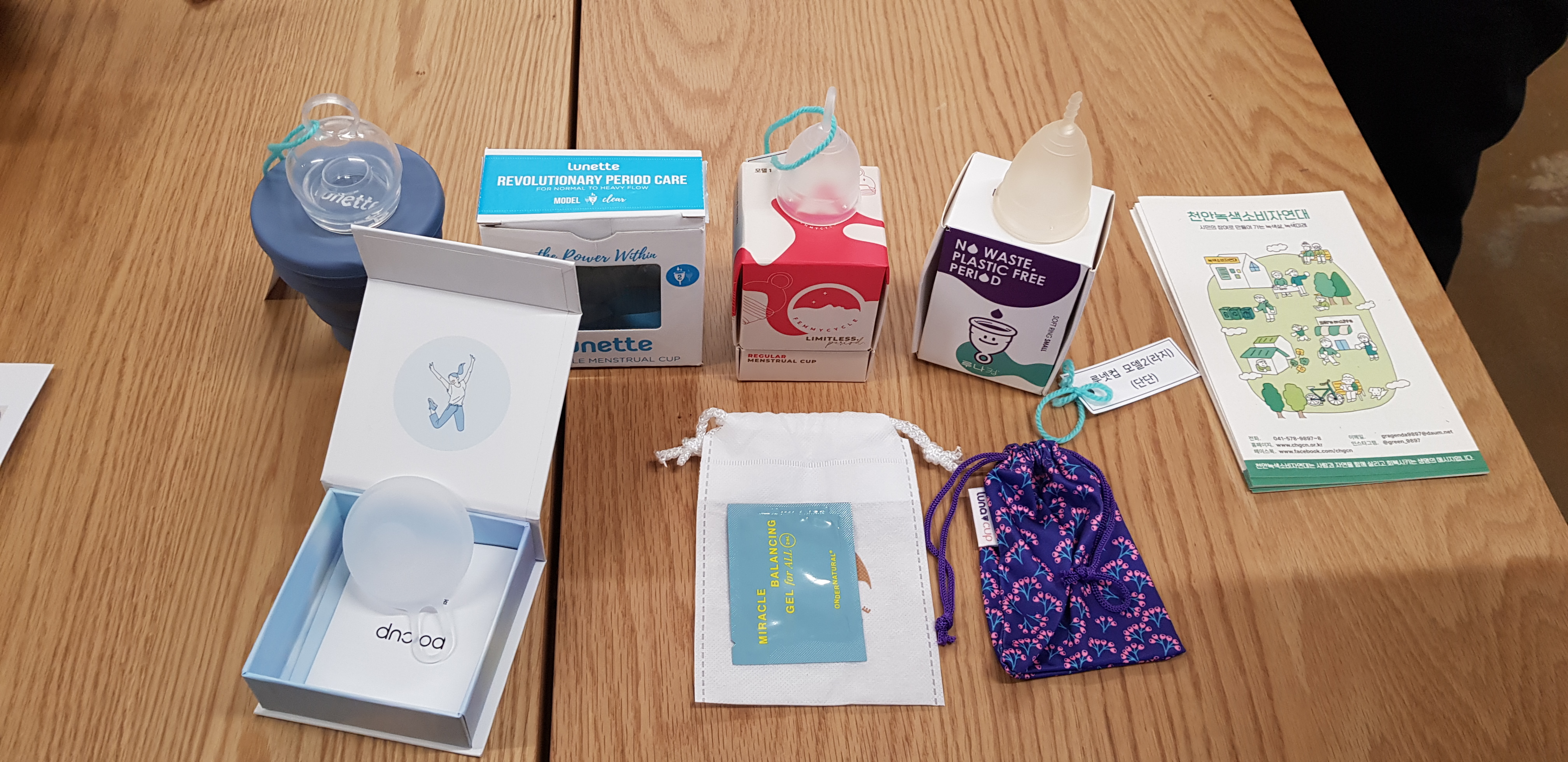 어제 만져 본 월경컵 4종(루나컵, 루넷컵, 페미사이클, 포이컵)은 푸른별상점에 계속 진열됩니다. 월경컵의 실물이 궁금하다! 단단함이 궁금하다! 크기가 궁금하다! 하시는 분들은 푸른별에 들러주세요.