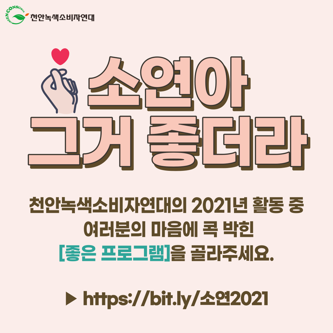 올해 천안녹색소비자연대가 진행한 여러 활동 중 여러분 마음에 콕 박힌 ‘좋은 프로그램’을 골라주세요. 보내주시는 소중한 의견을 귀담아 앞으로의 활동에 참고하겠습니다.