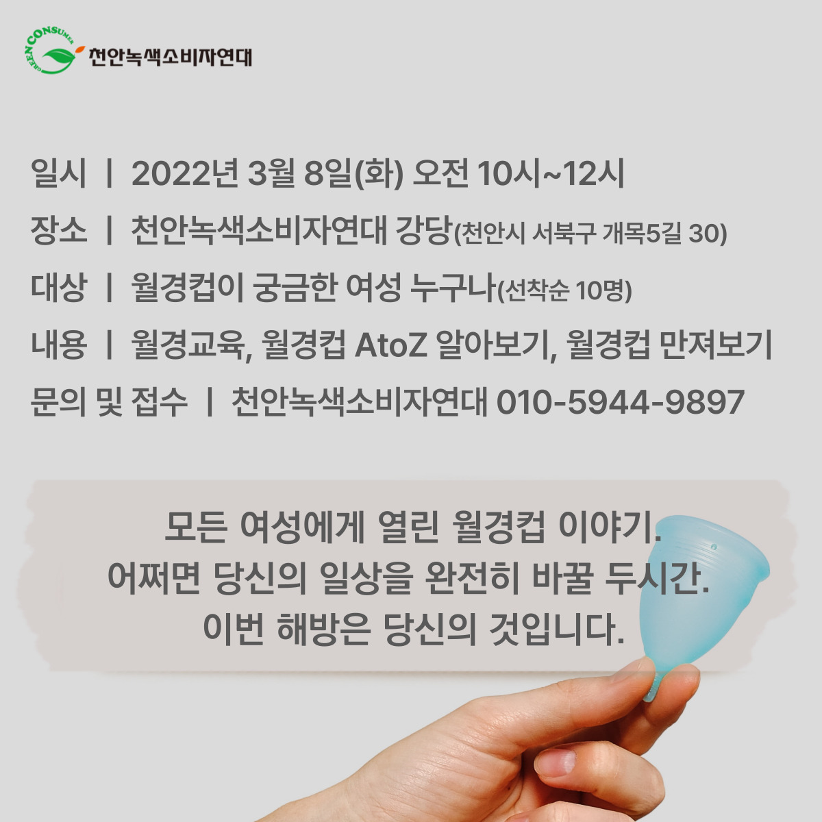 2022년 세계 여성의 날 테마는 [BreakTheBias-편견을 깨다]입니다. 월경은 인류의 절반이 전 생애에 걸쳐 경험하는 자연스러운 일이지만 수많은 편견을 꼬리표처럼 달고 있습니다. 월경에 대한 편견과, 월경용품에 대한 편견을 타파하는 월경컵 대화모임에 여러분을 초대합니다. 이번 여성의 날은 천안녹색소비자연대와 함께 기념해주세요.