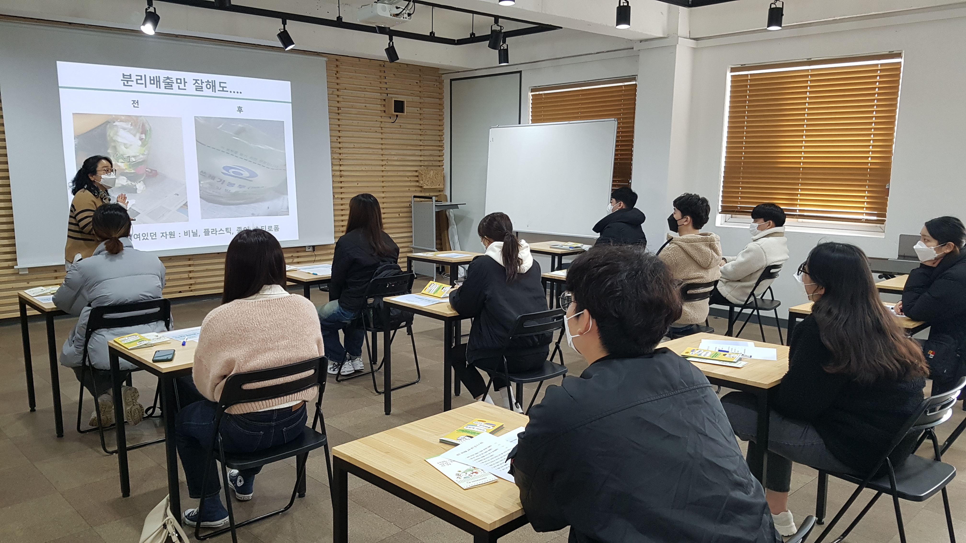 생활 특성 상 플라스틱 쓰레기 배출을 많이 하고 또 그만큼 쓰레기 문제에 관심이 높은 것이 대학생들입니다. 오늘 오전 대학생들을 대상으로 올바른 분리배출 교육을 진행했습니다. 분리배출의 4원칙(비우고, 헹구고, 분리하고 섞지 않기)에 대해 이야기 나누고 제로웨이스트에 대해서도 알아보았습니다.
