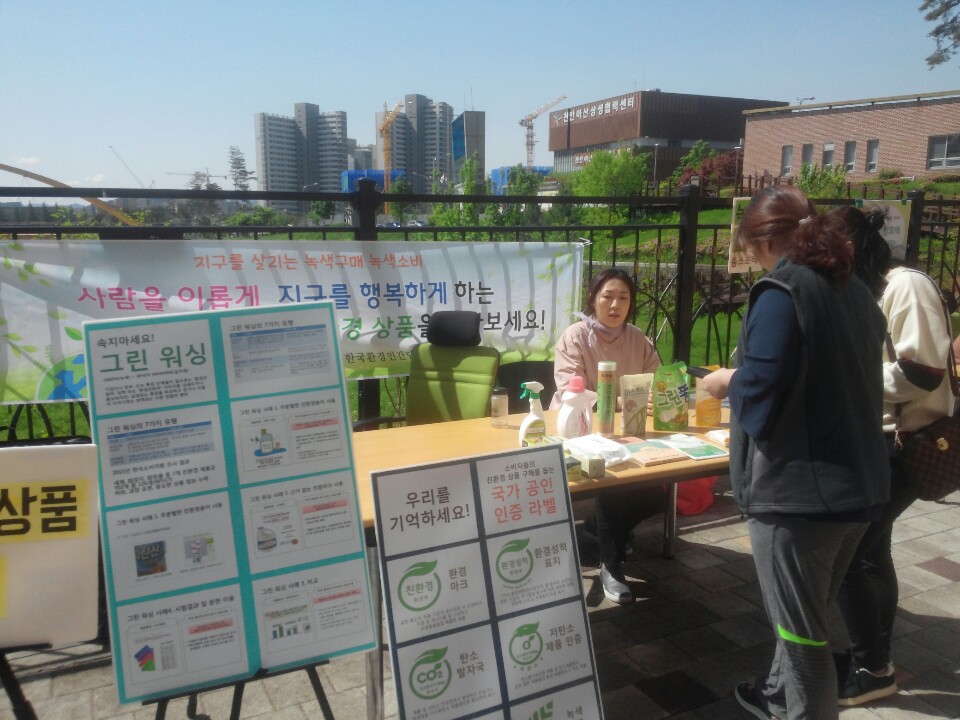 불당프라디움레이크에서는 친환경상품 캠페인을, 삼환나우빌 아파트에서는 지구의 날(4월 22일) 기념 생물종 다양성 지키기 캠페인을 함께 진행했습니다. 친환경 상품 전시 부스에서 공정무역 커피믹스를 나누어 드렸는데 공정무역이 무엇인지에 대한 문의들을 종종 주셨습니다. 일반 시민들에게도 꽤 알려져 있다고 생각했었는데 아직은 운동이 더 필요한 것도 같네요.