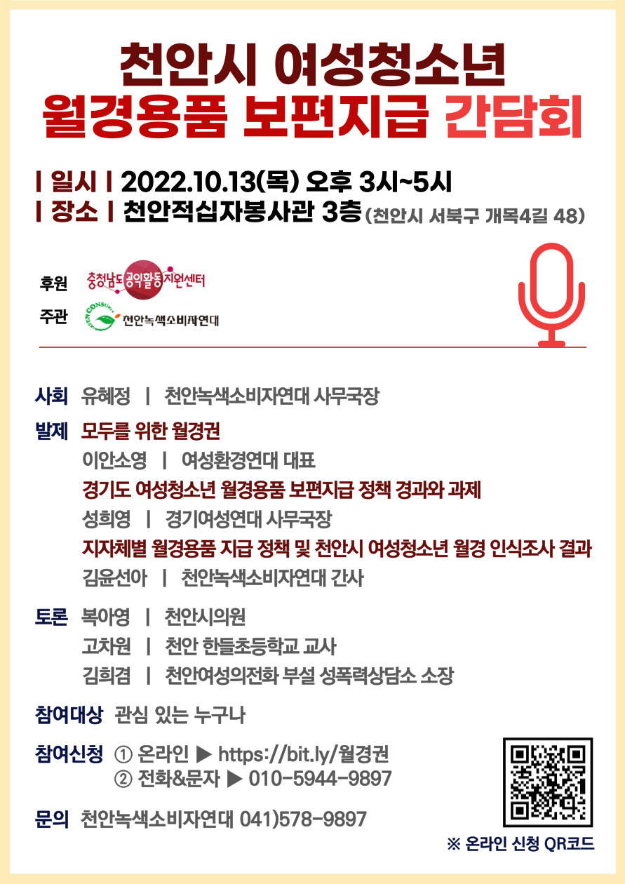 녹색살림 운동/월경권 천안시 여성청소년 월경용품 보편지급 간담회 천안녹색소비자연대 2022. 9. 22. 10:10 ※간담회 참여 신청 https://naver.me/5eTtnzH4 천안시 여성청소년 월경용품 보편지급 간담회 참여신청 form.office.naver.com ※간담회 발제 자료 1. 모두를 위한 월경권_이안소영.pdf 2.26MB 2. 경기도 여성청소년 월경용품 보편지급 정책 경과와 과제_성희영.pdf 2.05MB 3. 월경용품 지원사업 현황 및 청소년 월경경험 조사 결과_김윤선아.pdf 1.69MB 저작자표시 (새창열림)
