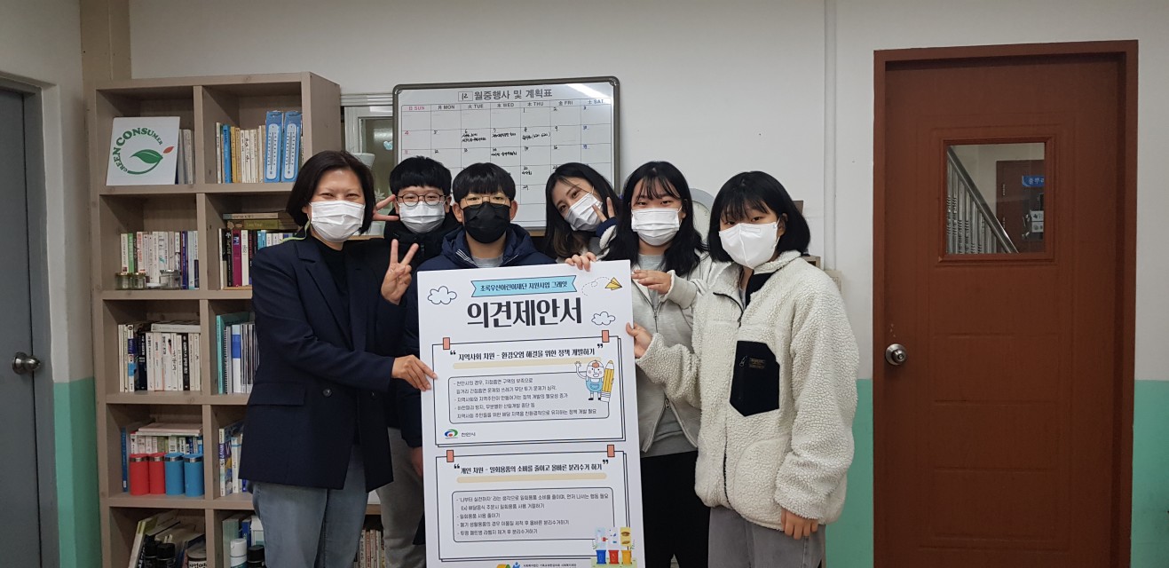 지난 8월 천안시종합사회복지관의 환경봉사 동아리 청소년들에게 녹색소비 교육을 지원한바 있습니다. 3개월의 활동을 마친 청소년들이 녹소연을 방문했습니다.