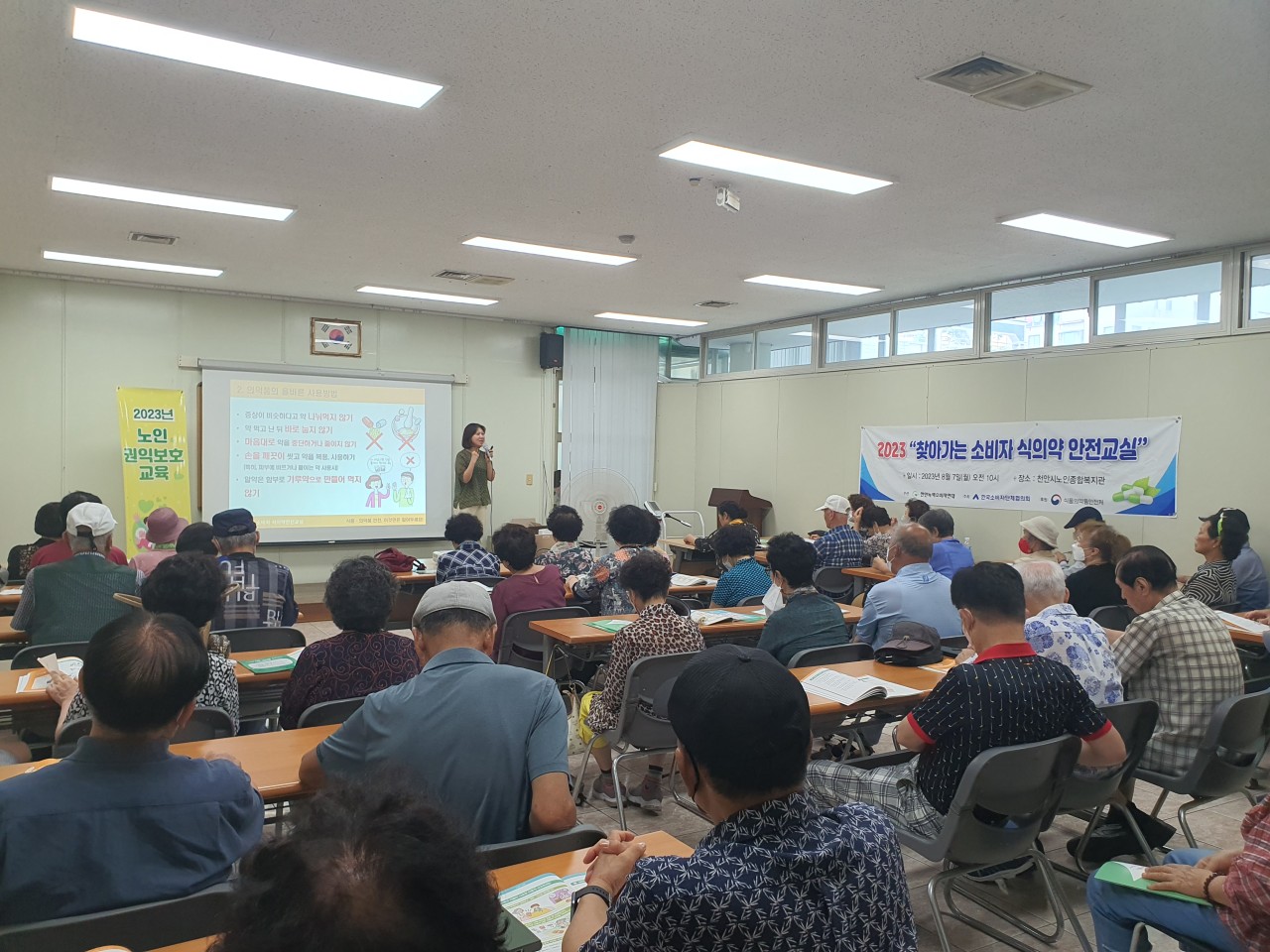 찜통더위 속 천안시노인종합복지관에서 식품의약품 안전교육을 진행하였습니다.