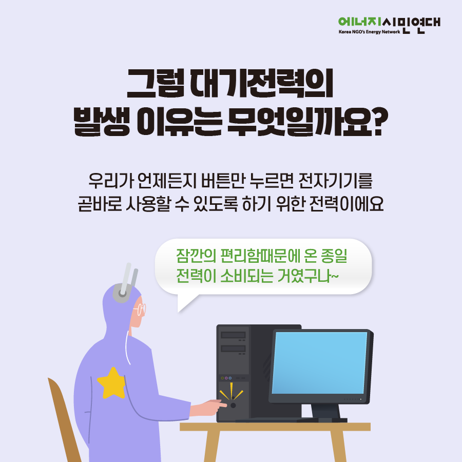 대기전력은 우리가 언제든지 버튼만 누르면 전자기기를 곧바로 사용할 수 있는 전력이에요.