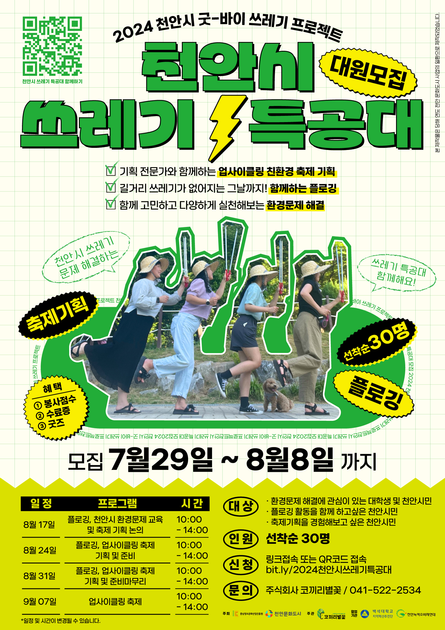 자원순환 운동 천안시 쓰레기 특공대 대원모집 천안녹색소비자연대 2024. 8. 1. 09:12 신청링크 http://bit.ly/2024천안시쓰레기특공대 2024 천안시 쓰레기 특공대 모집 참가신청 연락처 (예: 010-0000-0000 ) 숫자 중간에 - 꼭 부탁드려요! * docs.google.com 저작자표시 (새창열림)
